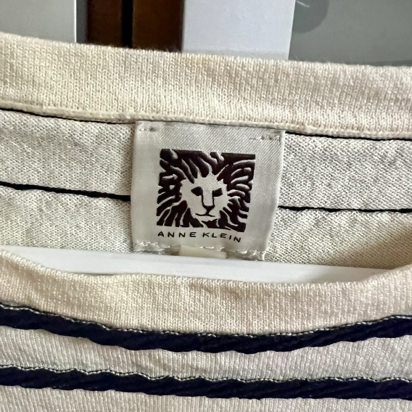 This is an Anne Klein striped t-shirt. It's a comfortable, classic piece for your wardrobe. Made with a soft fabric blend.