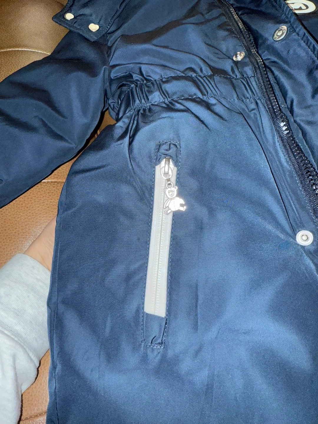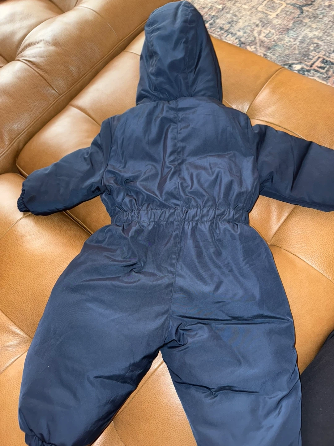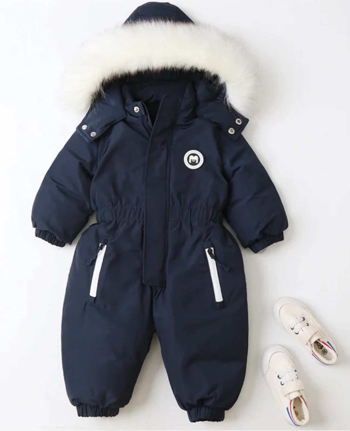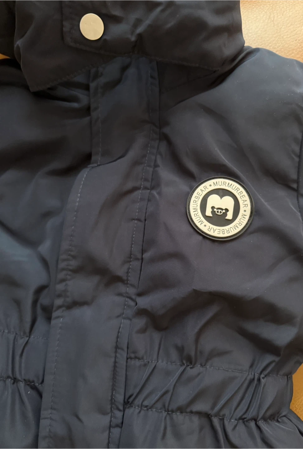 Here's a cozy navy blue snowsuit from Murmurbear! It has a hood and cute zipper details. Perfect for keeping your little one warm this winter, for snowy playdates, winter walks, or school commutes, it offers maximum protection from the wind and cold while keeping your child looking adorable. Has water-resistant finish, baby worn just once. Pet free - smoke free house. For ages 0- 20 months
