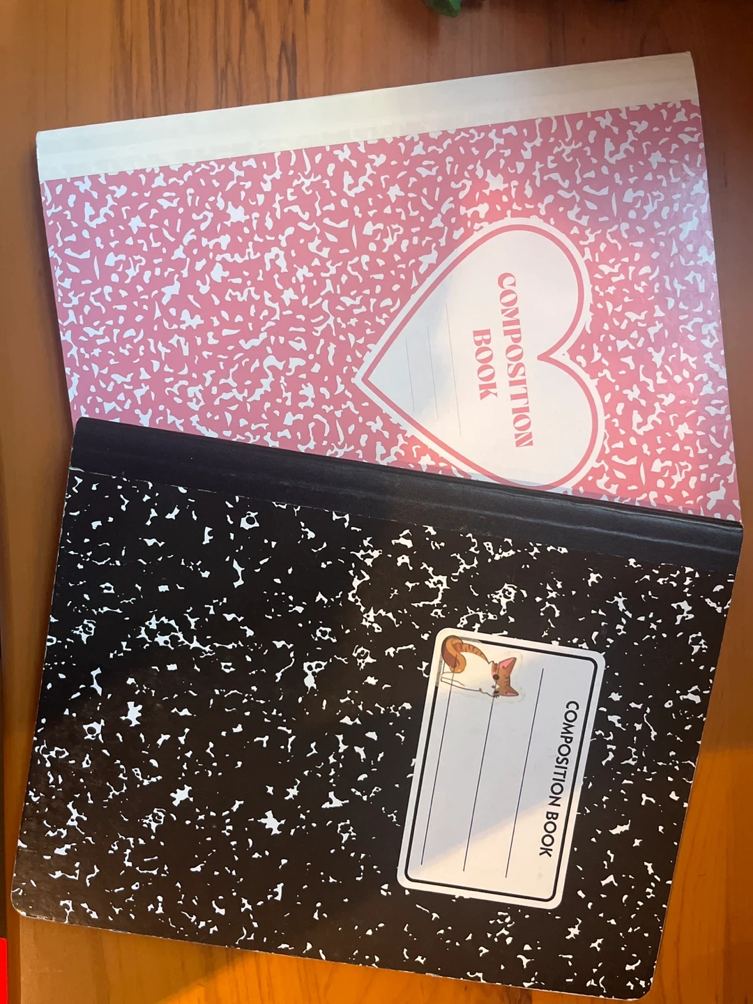 You get two composition notebooks. One has a pink marble cover with a heart design. The other has a black marble cover with a cute cat sticker and a label space. They're standard size for note-taking.