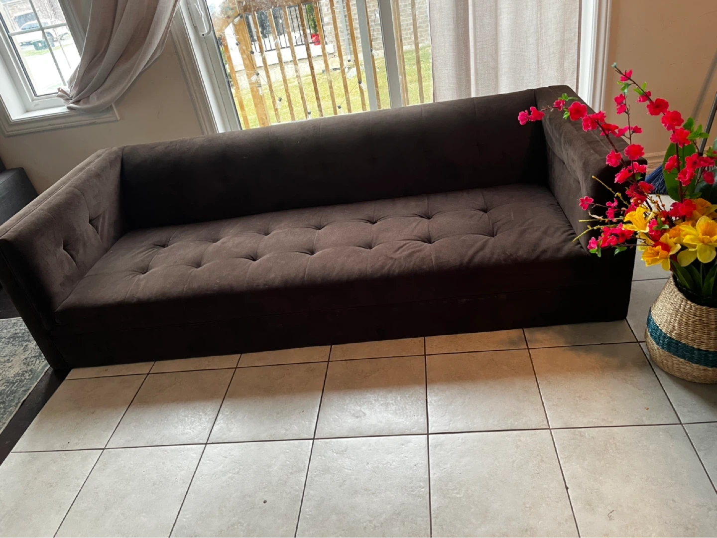 Modern brown tufted sofa. It's upholstered in a soft fabric. Comfortable seating for two or three people. Long one is 83 inches and second one is 59 inches.