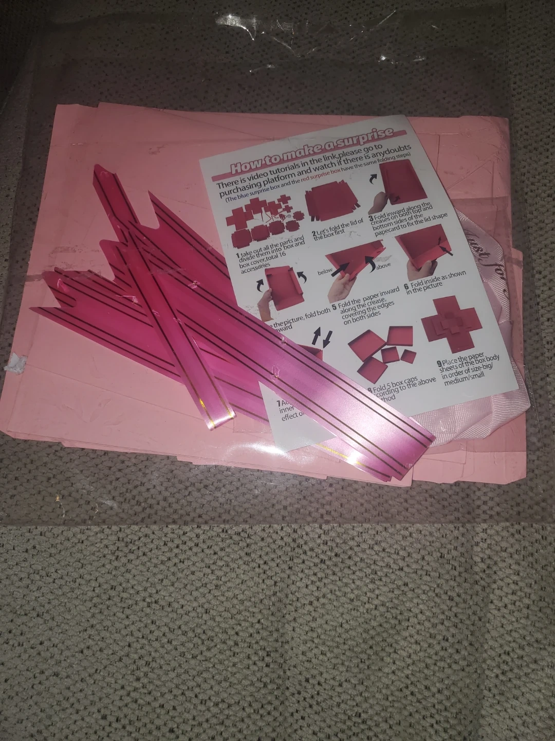 This craft kit includes pink cardstock, ribbon, and decorative strips for making a surprise box. Instructions are included on how to assemble it. Perfect for creating custom gift boxes!