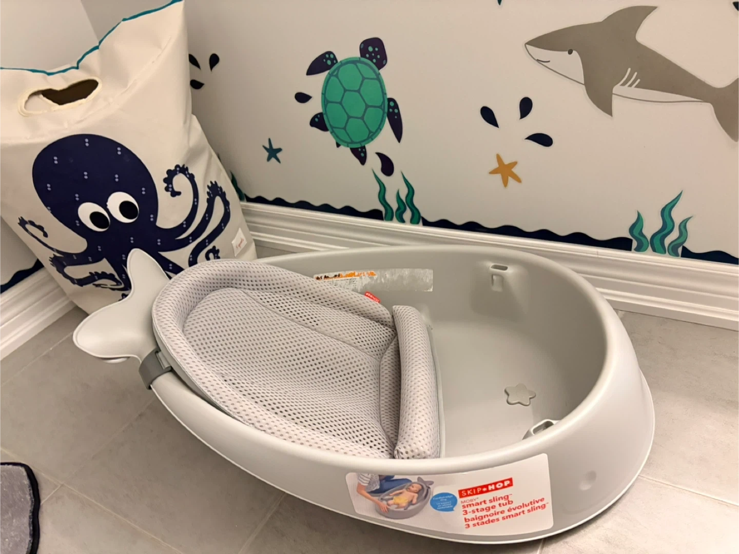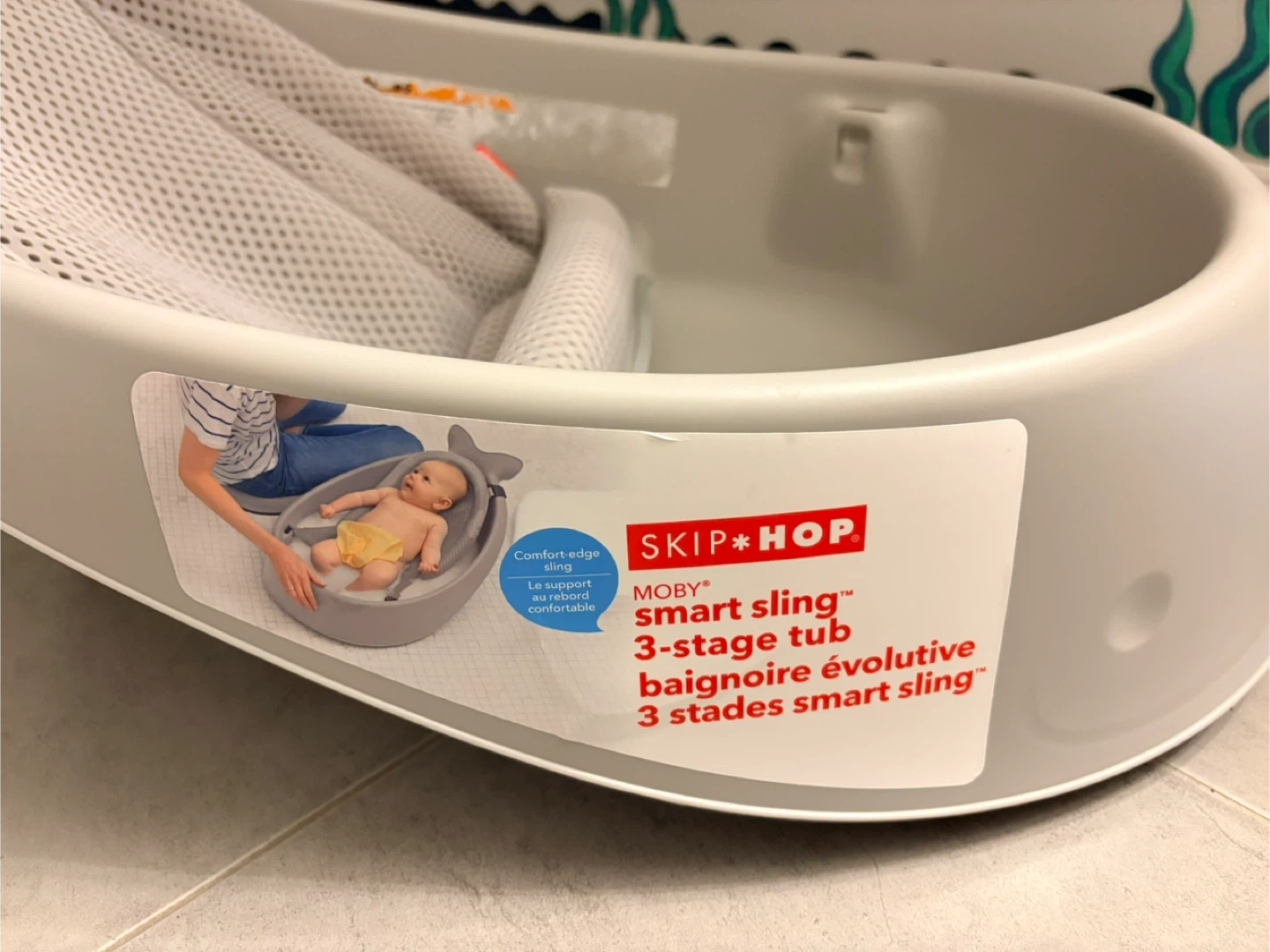 This is the Skip*Hop Moby smart sling 3-stage tub. It's designed for babies from newborn to toddler. The smart sling adjusts to three stages to support your baby as they grow.