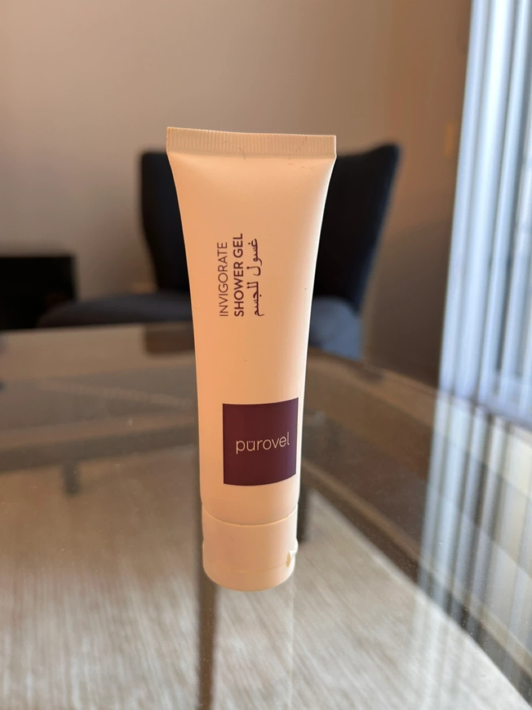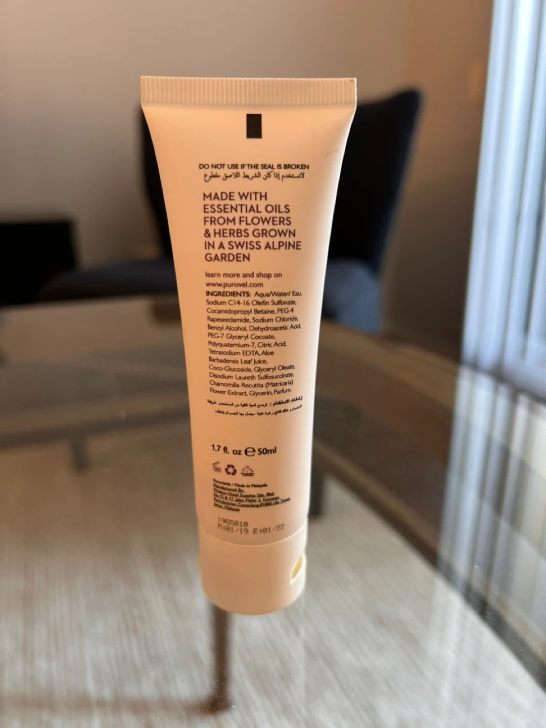 This Purovel shower gel is 1.7 fl. oz. It's made with essential oils from flowers and herbs grown in a Swiss Alpine garden. The formula includes ingredients like Aloe Barbadensis Leaf Juice and Chamomilla Recutita (Matricaria) Flower Extract.