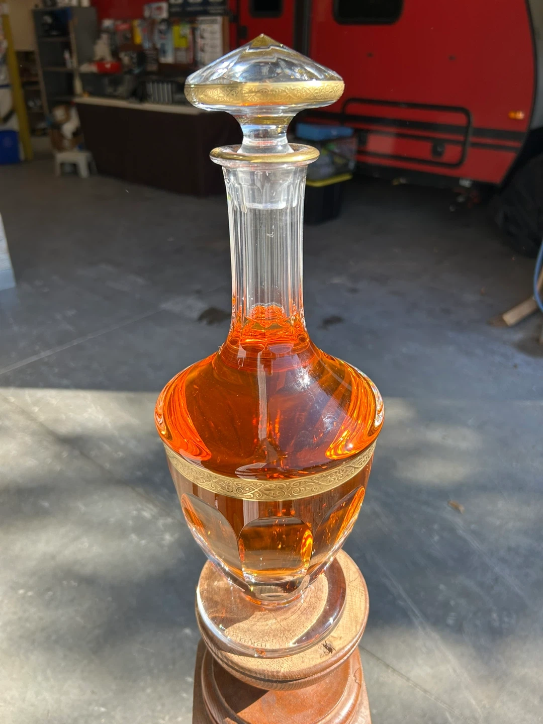 Moser lead free lady Hamilton crystal decanter 24k gold trim. Features decorative gold trim around the base and a faceted stopper. It's perfect for serving spirits or as a decorative piece.
