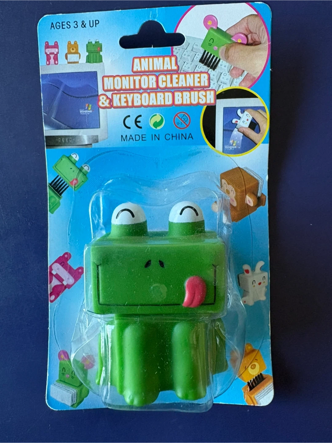 This is an animal-shaped monitor cleaner and keyboard brush. It's designed for ages 3 and up. The item is green with cartoon eyes. It’s new and in original wrap.