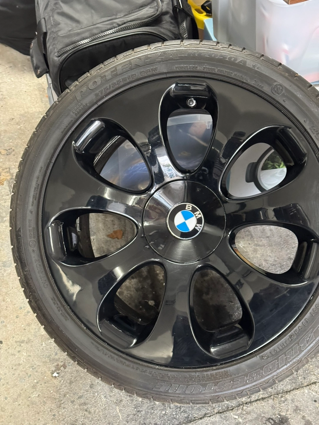 This is a set of 4 BMW alloy wheel with a tire mounted. It's black and has a multi-spoke design. The tire appears to be a Bridgestone Potenza RE050A.