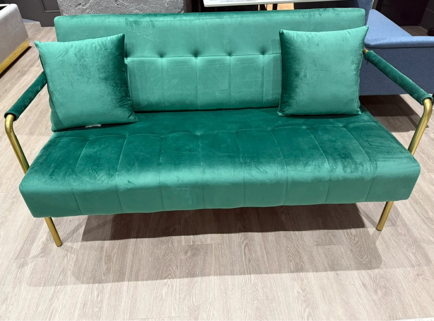 Selling a lovely emerald green loveseat sofa! It features a plush velvet material and comes with two matching cushions. The gold-tone legs add a touch of elegance to any space. Perfect for a small apartment or cozy nook!