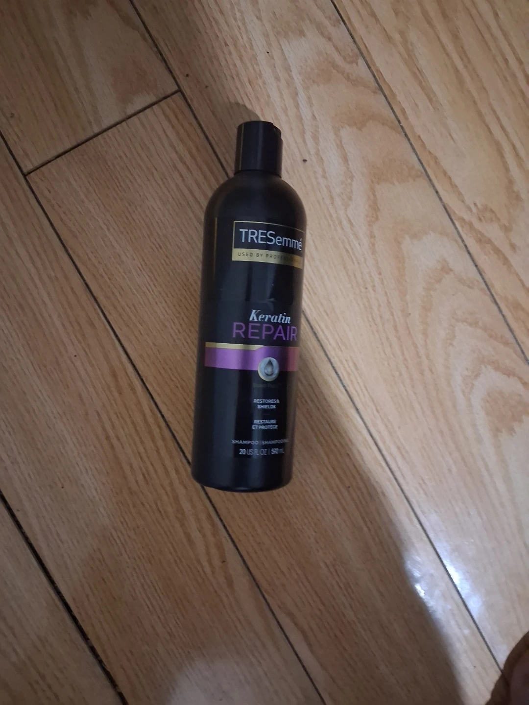 TRESemmé Keratin Repair shampoo. It restores & shields hair. This shampoo is 20 US FL OZ or 591 mL.