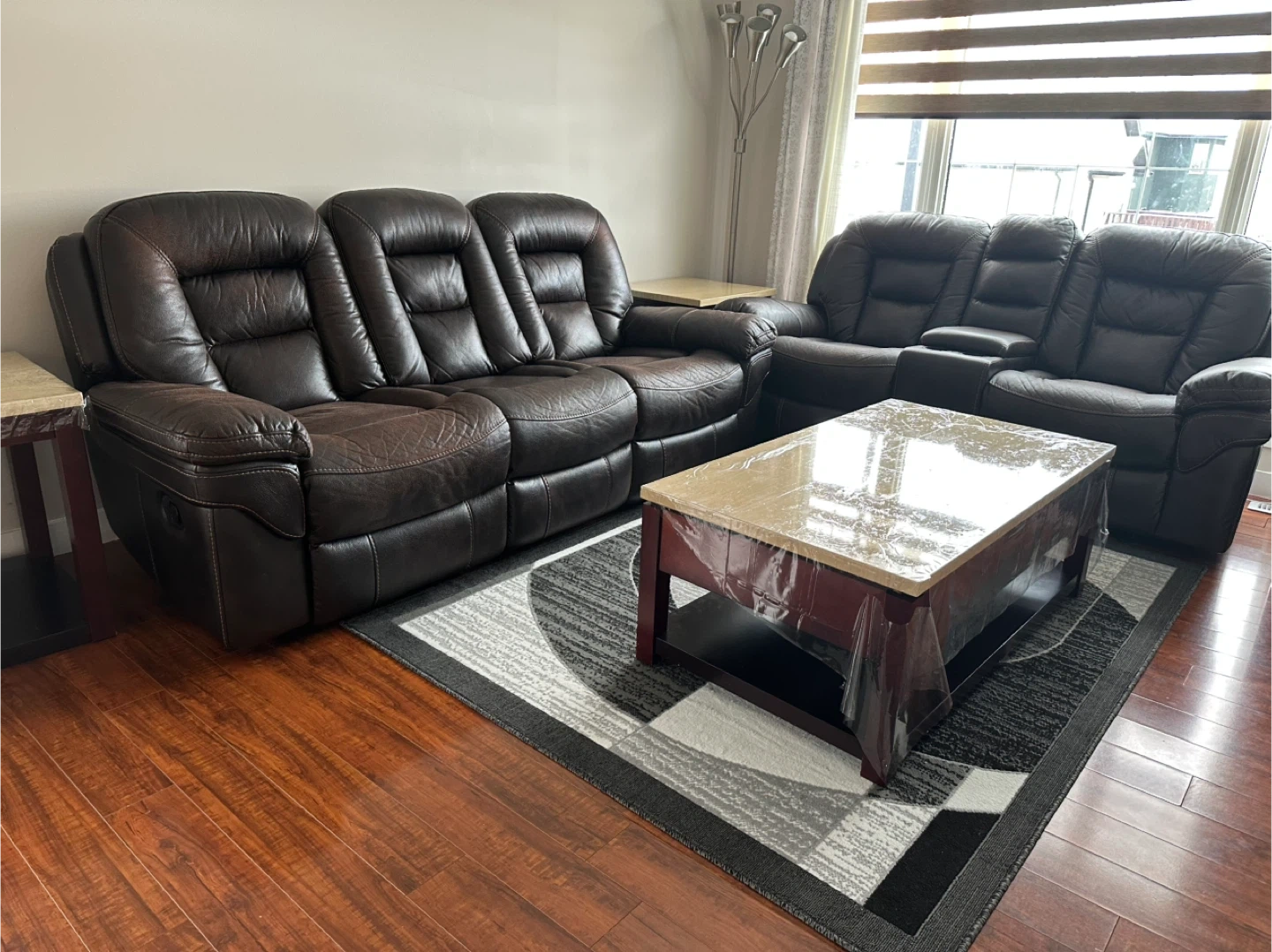 Selling a comfortable brown leather reclining sofa set. It includes a three-seater sofa and a loveseat. The sofas show some signs of wear, but are still in good condition and very cozy! Great for a family room or entertainment area