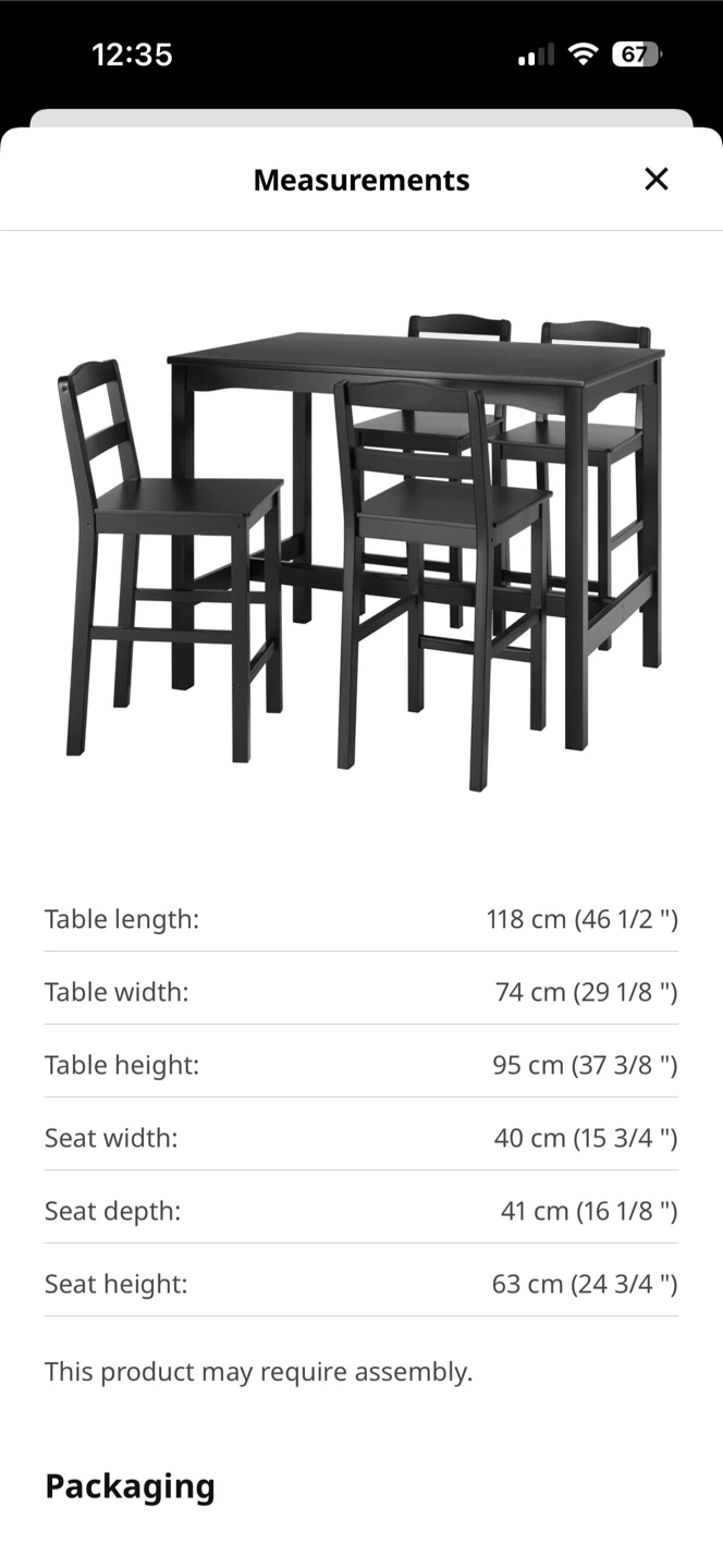 This is the HÄGERNÄS bar table and 4 bar stools. It's a black stained pine set. The table measures 118 cm long, 74 cm wide, and 95 cm high. Stool seat is 40 cm wide and 41 cm deep. Stool height is 63 cm. This set is used good and comes with 4 green colored removable chair pads. The set is assembled and ready to pick up as is.
