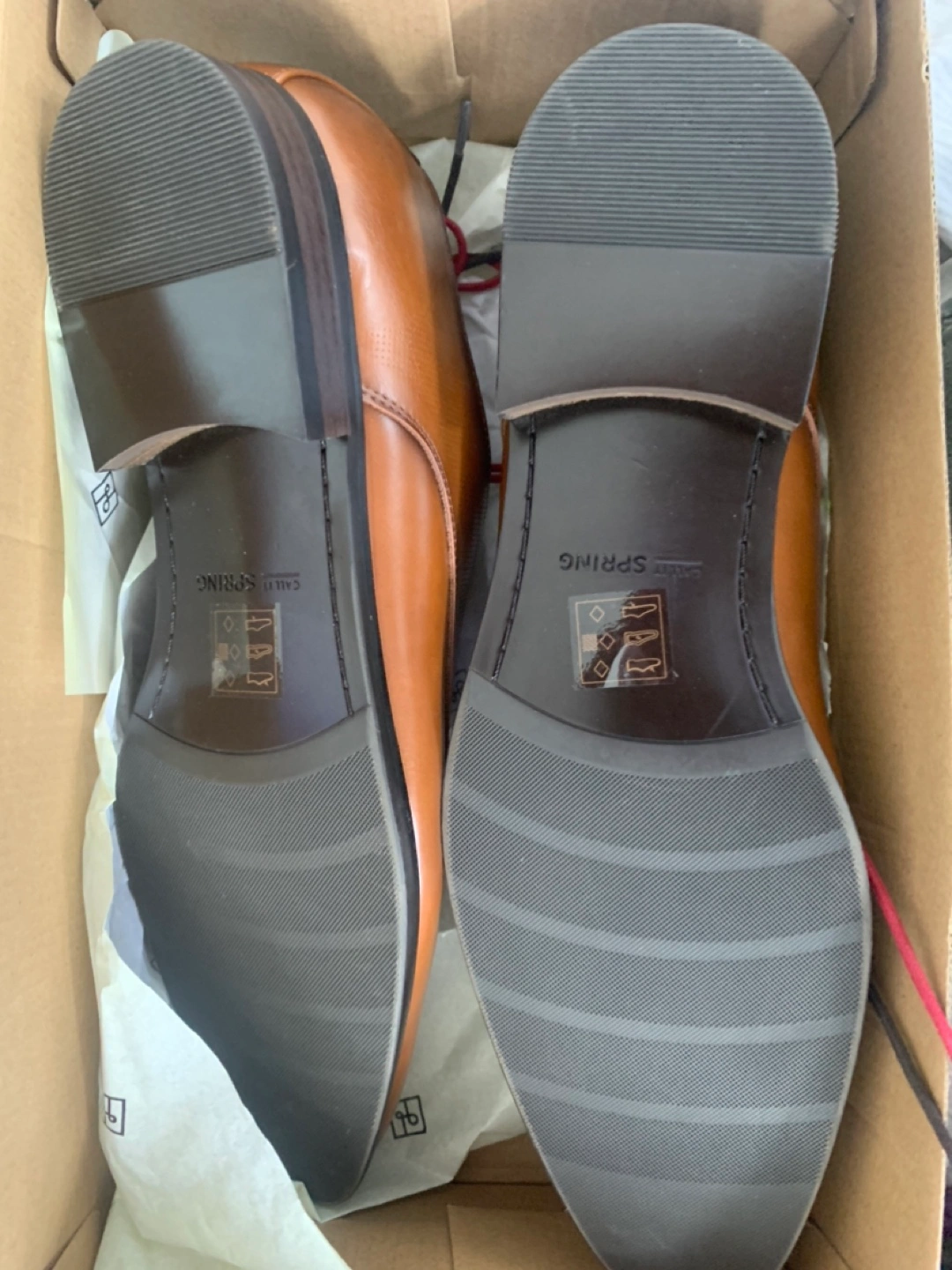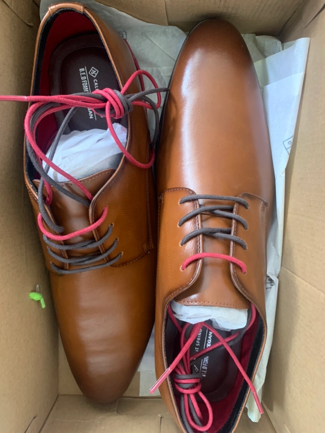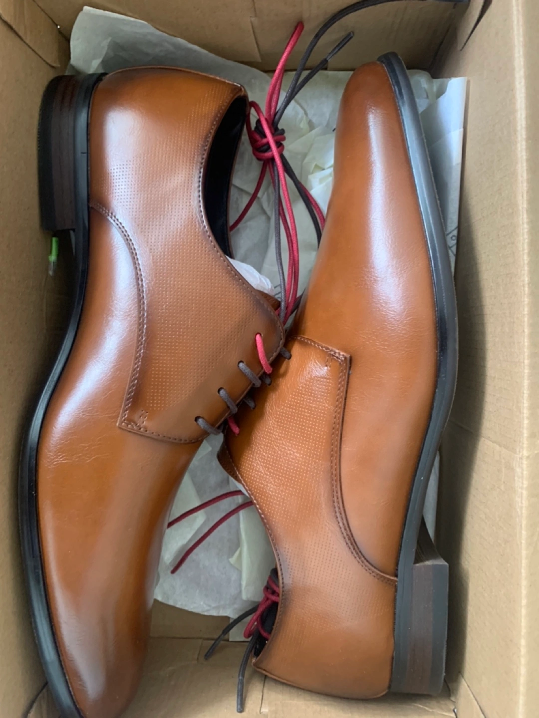 The dress shoes are in a box. They are brown with red and grey laces. It can be a lovely addition to your wardrobe.