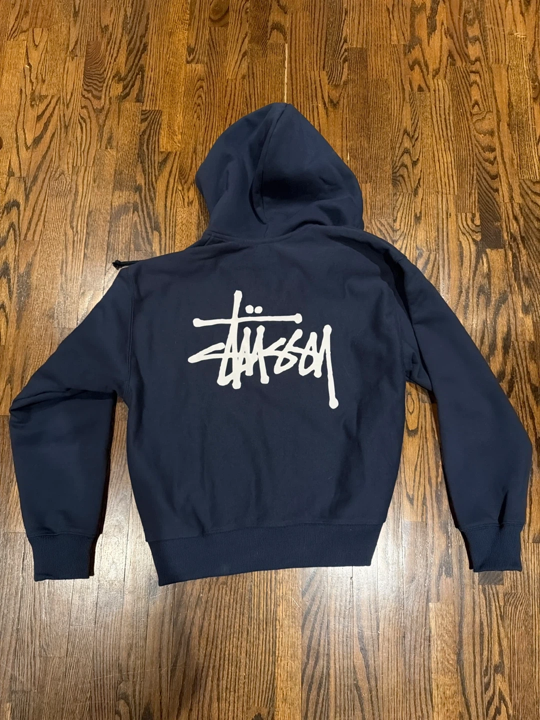 Selling a Stussy zip-up hoodie in navy blue! It features the classic Stussy logo on the front and back. Perfect for layering or wearing on its own. It's brand new never worn, includes original tag. Original price: $160.