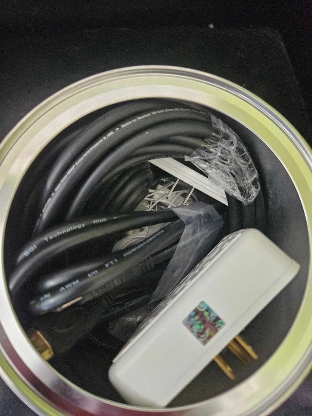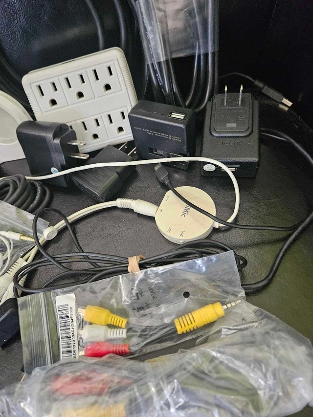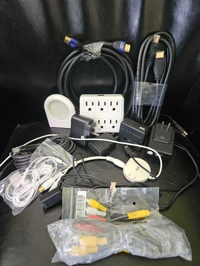 Power: 6-outlet wall tap + 4 USB charging blocks. Video: 2 High-Speed HDMI cables + RCA sets. Data/Audio: Ethernet cable, USB-C, and a line-out converter, Wired earbuds and a puck light. I'm probably forgetting to list a few things seen in the pics. Comes in the Maxwell House tin. Pick up in Eagle Place.