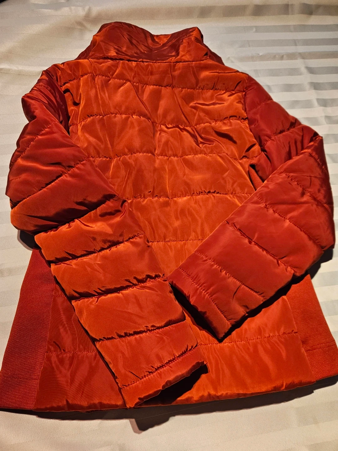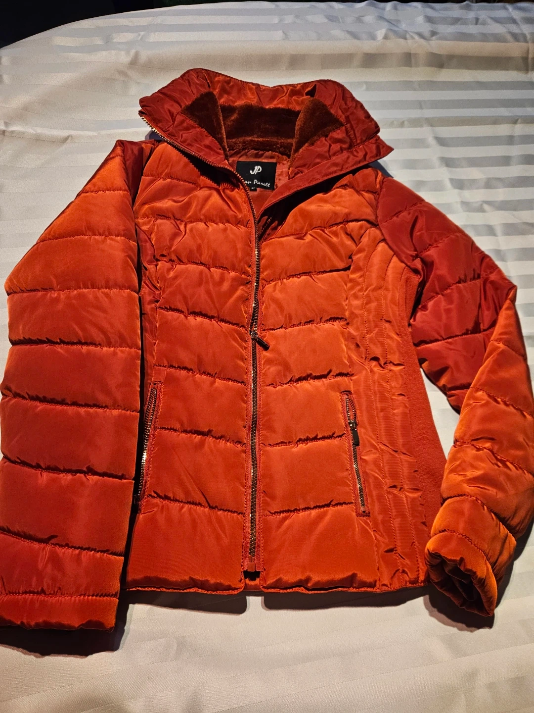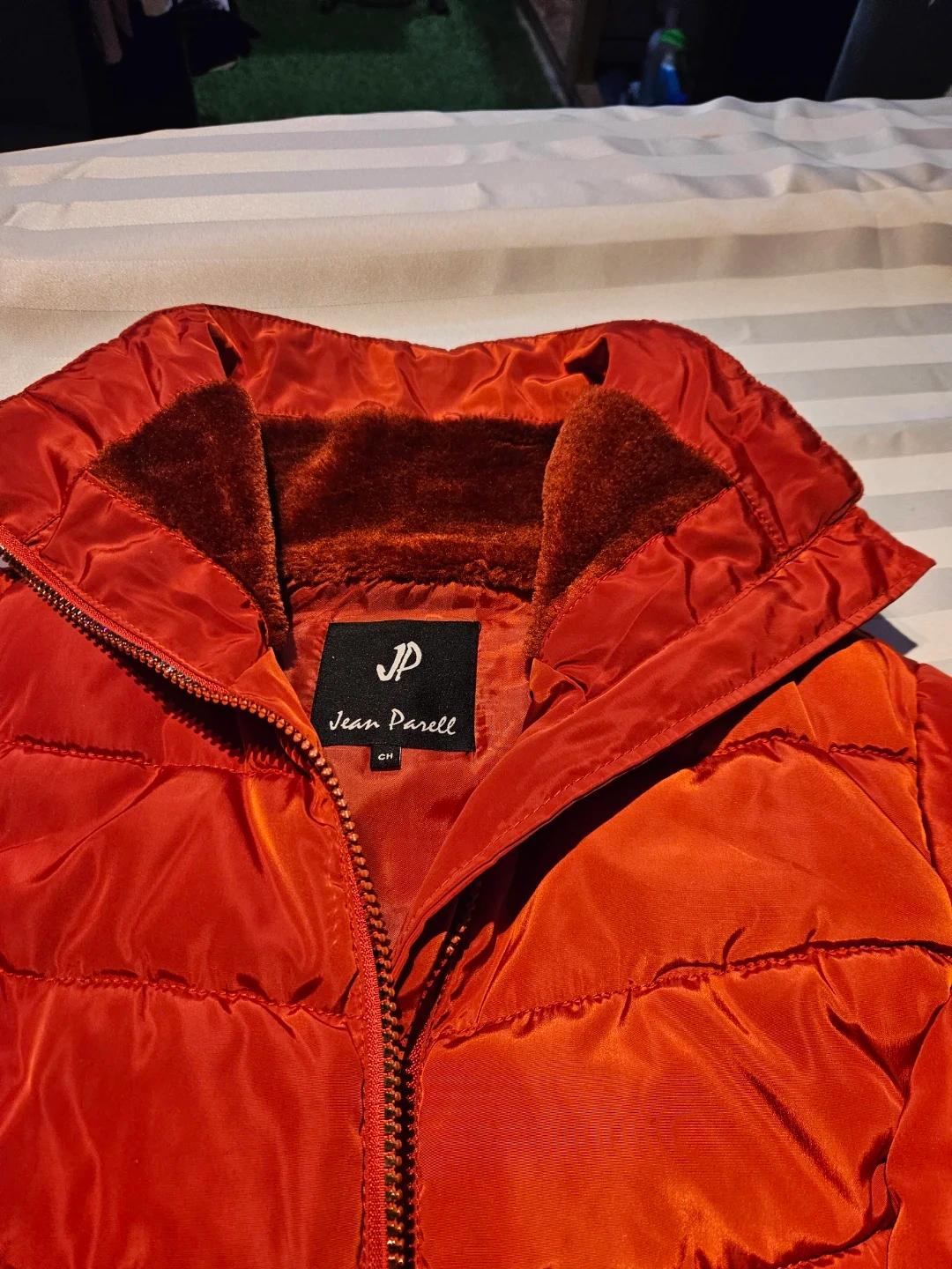 This is a Jean Parell puffer jacket in a vibrant red colour. It features a full zip closure and zippered pockets. The jacket has a warm, insulated design perfect for cooler weather.
