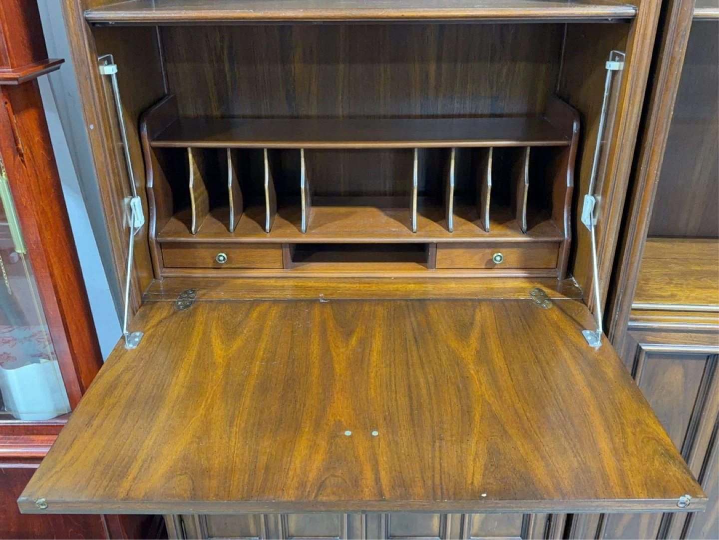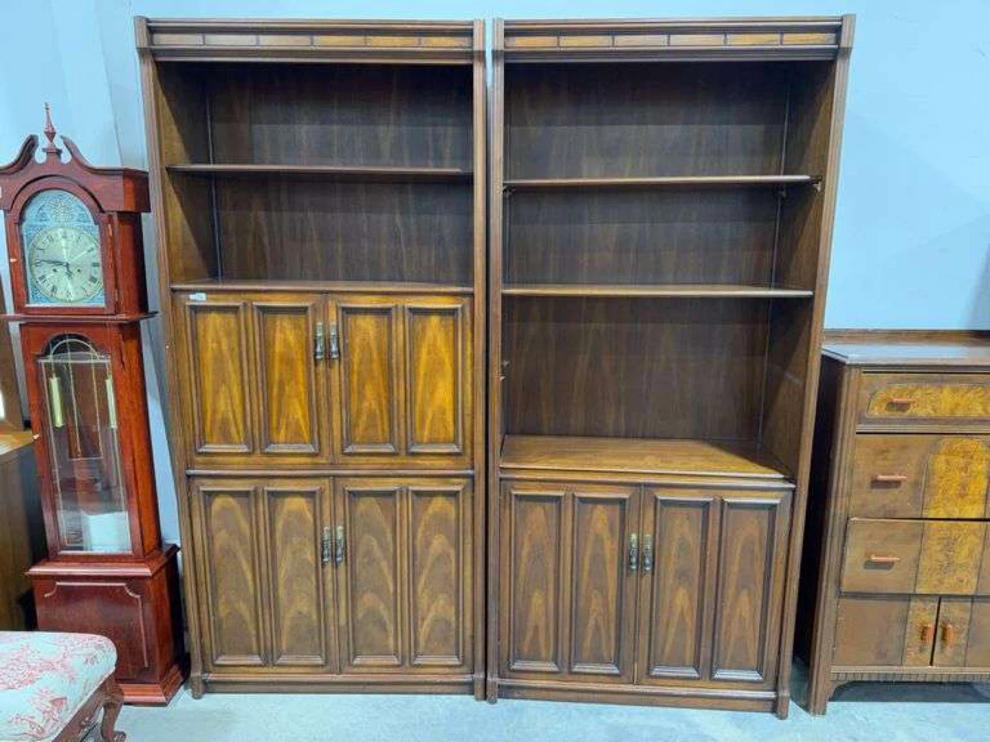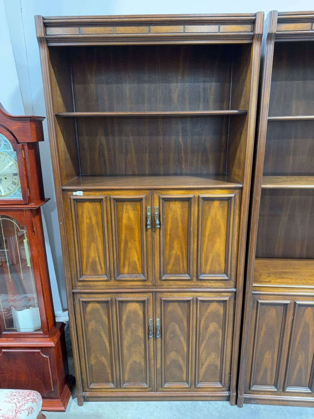 A two-piece wooden bookshelf unit featuring open shelving on top and cabinet doors below. Each cabinet section has double doors, and the left unit includes a fold-down desk surface with internal organizers and small drawers. Rich wood finish provides a classic look.