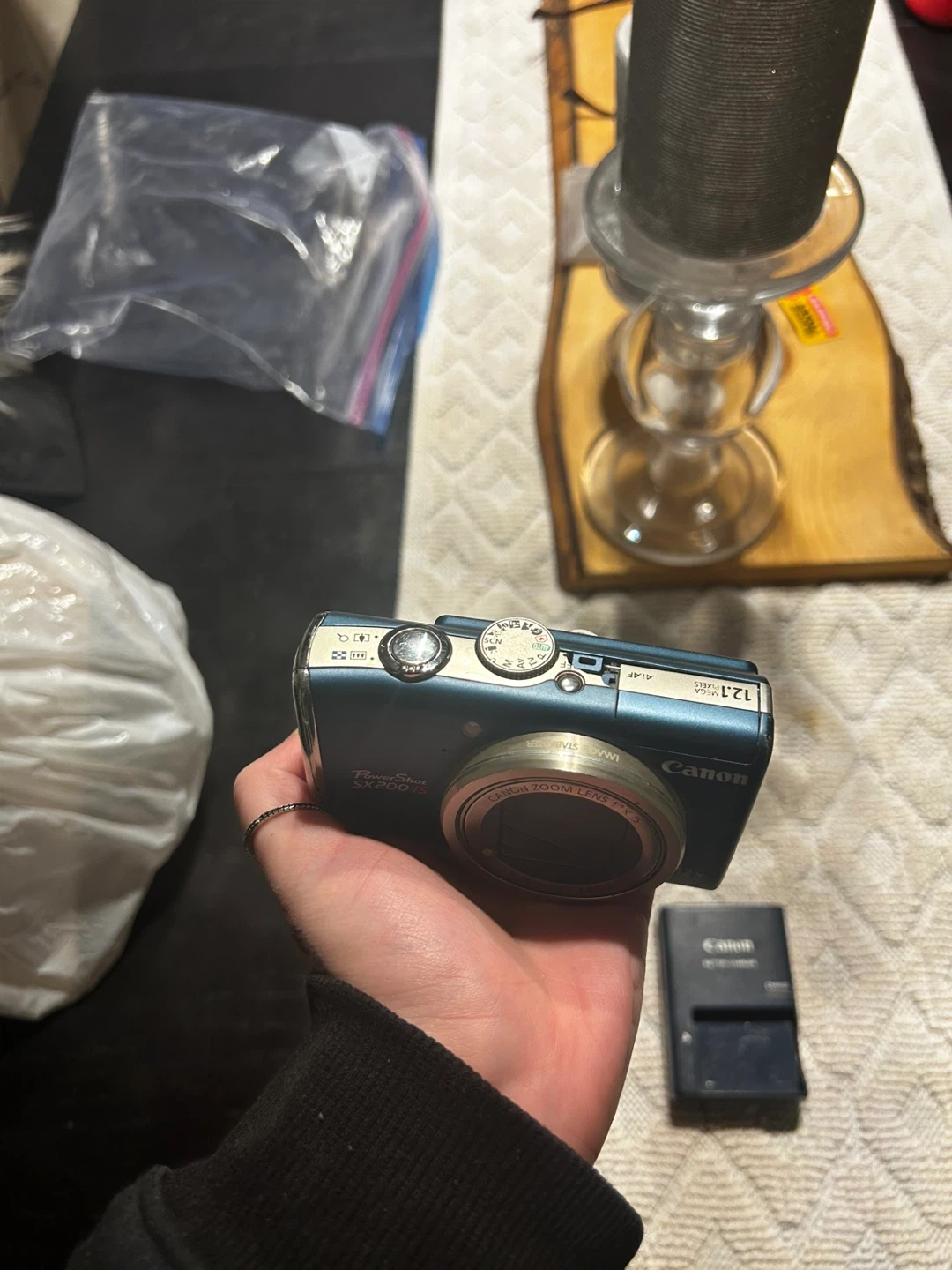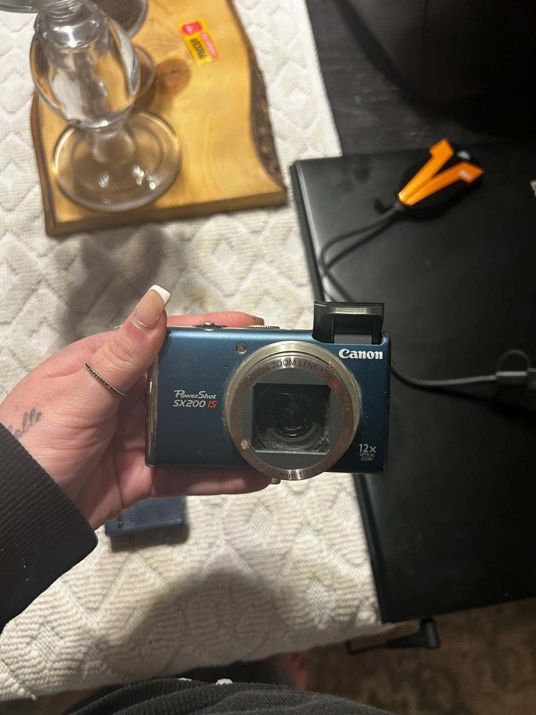 This blue Canon PowerShot camera has 12.1 megapixels and 12x optical zoom. It comes with a battery charger. It's a nice compact camera for everyday shots!