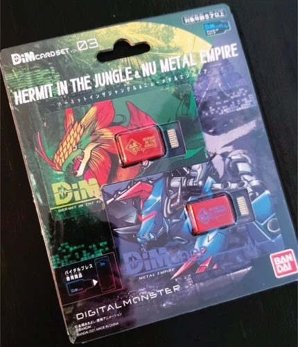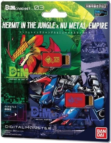 Dive into the evolution of Digimon with this exclusive Dim Card set, featuring the enchanting "Hermit in the Jungle" and the futuristic "Nu Metal Empire"! Elevate your V and BE Vital Bracelet experience with two captivating journeys that seamlessly blend nature and machinery. Set Contents: Hermit in the Jungle Dim Card x1 - Embark on an evolutionary adventure through lush greenery, where plant Digimon thrive in their natural habitat. The card is focused on Palmon and its digivolution tree. Nu Metal Empire Dim Card x1 - Immerse yourself in the mechanical wonders of the Nu Metal Empire. This card unveils evolution routes featuring lurking mechanical Digimon. The card is focused on Hagurumon and its digivolution tree. Enhance Your Digimon Experience: Combine the power of both Dim Cards for a comprehensive Digimon journey, uncovering the secrets of the jungle and the technological wonders of the Digital Monster world.