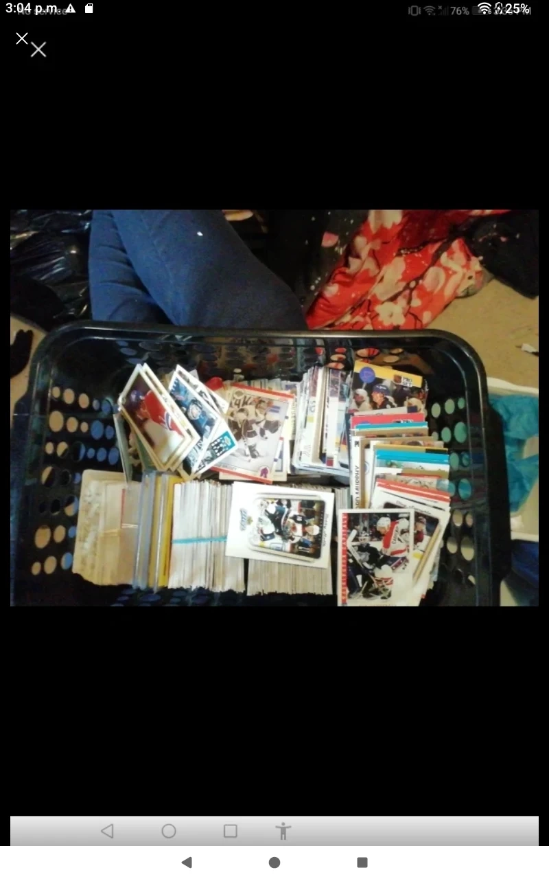 A large collection of assorted hockey trading cards. Many different players and years are included. Cards are organized in stacks.