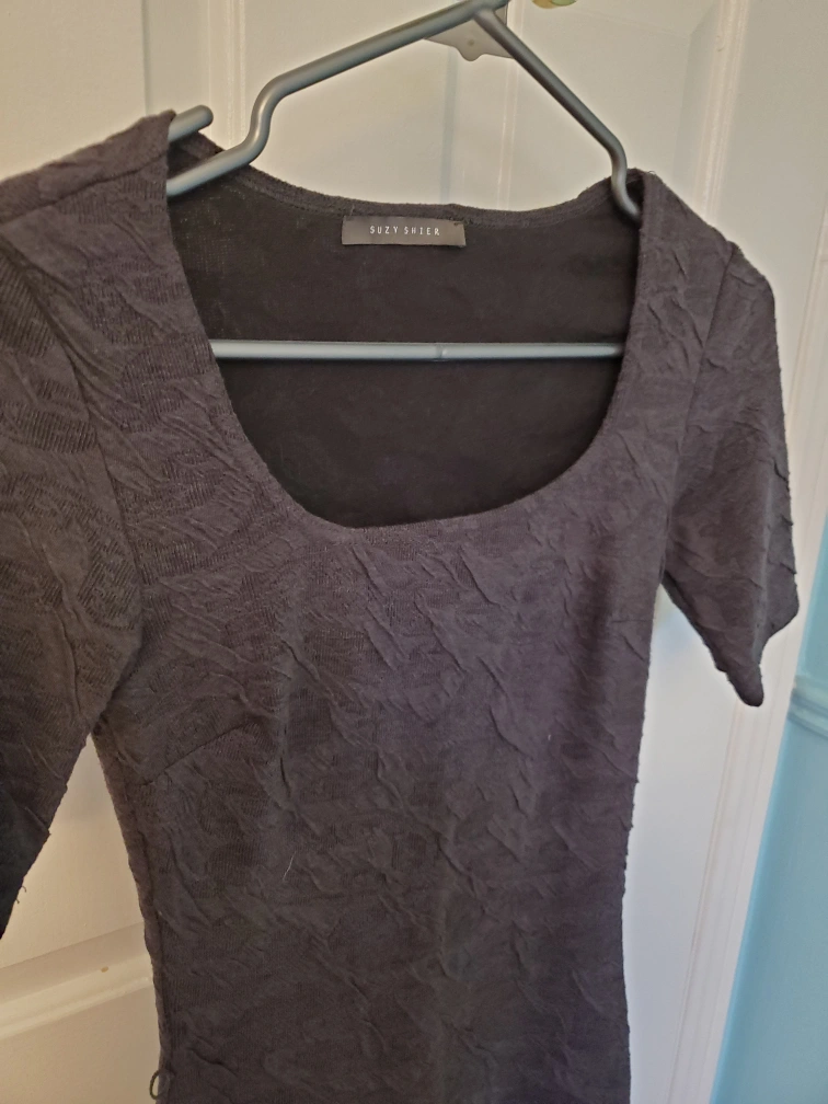 Selling a dark grey xs bodycon textured dress from Suzy Shier. It has a square neckline and short sleeves. Great for a night out or a special occasion!
