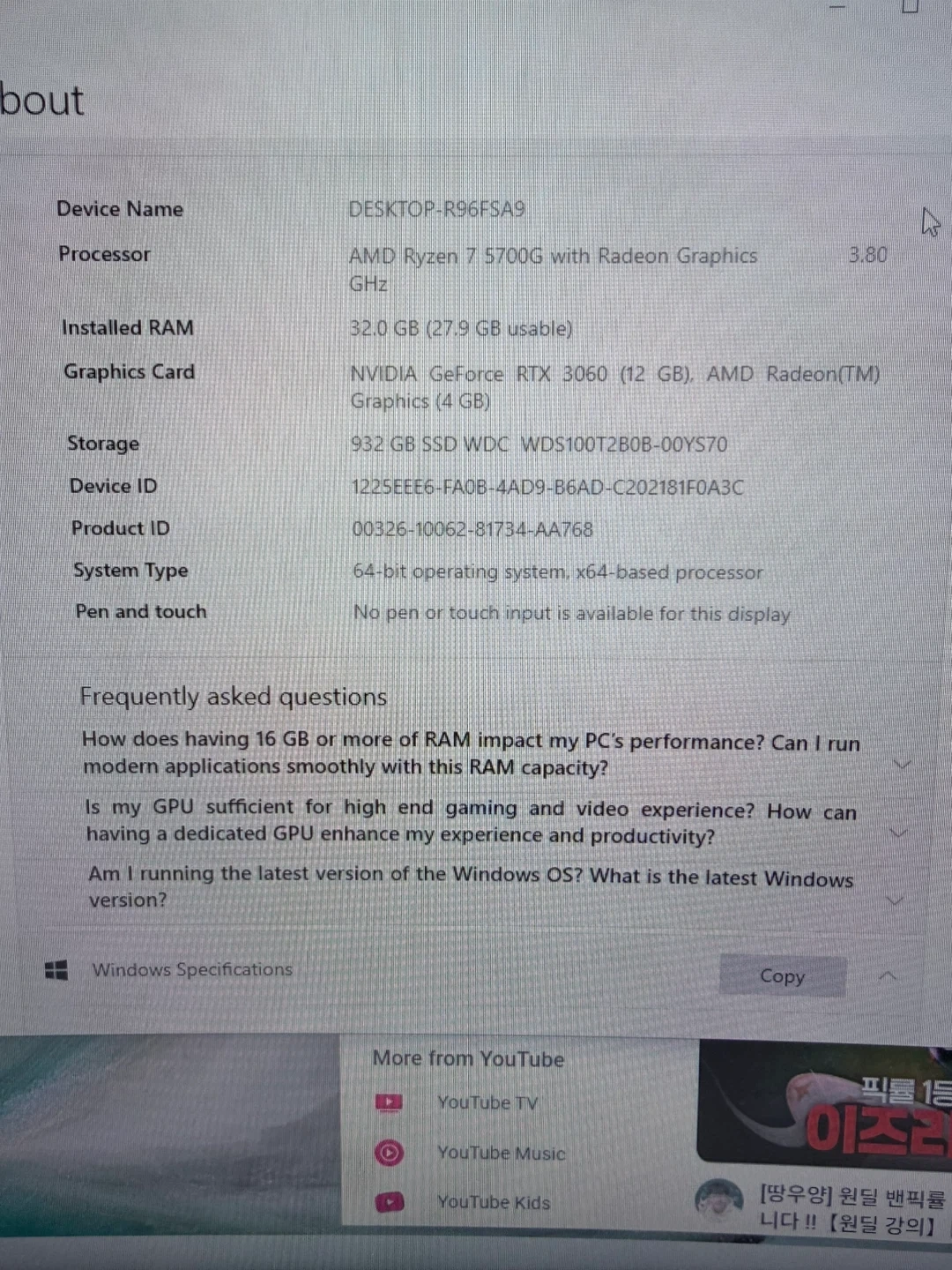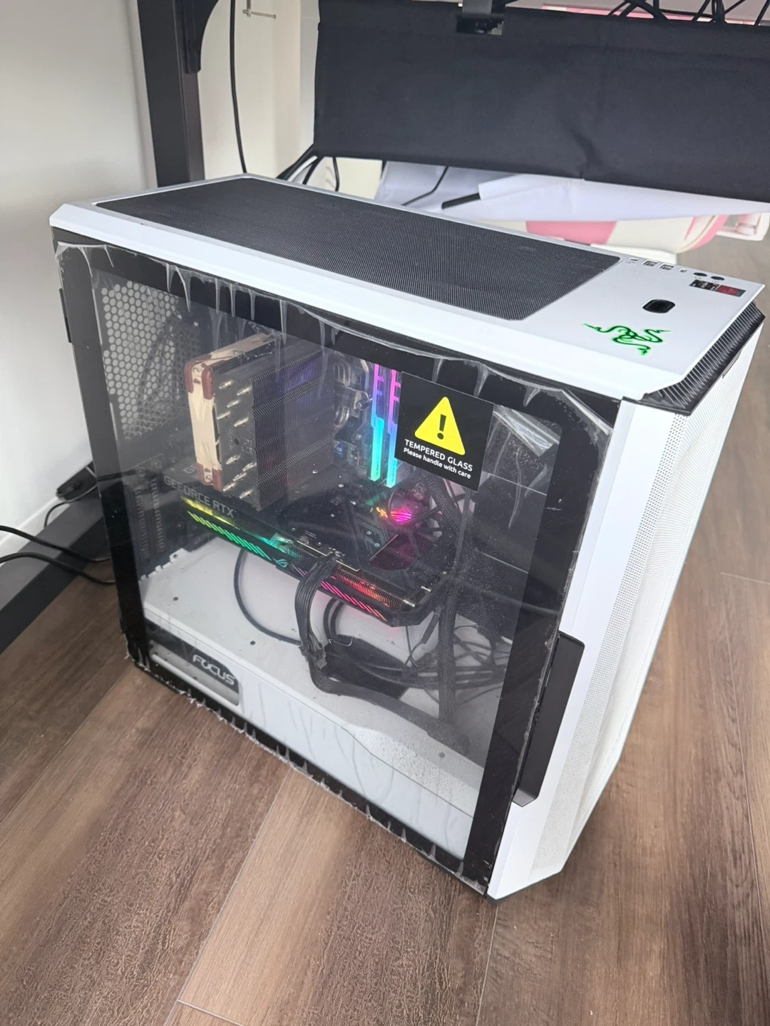 Desktop PC with AMD Ryzen 7 5700G processor. This PC's components make it suitable for gaming and productivity tasks. I did not remove the plastic. If you remove it, it should be as clean as brand new! AMD Ryzen 7 5700G CPU used price range: $105-$150 ASUS ROG RTX 3060 12GB used price: $200-$300 DDR4 RAM 32GB used price: $70-$140 Sum of the parts above with the lowest price: $375 With the power supply, motherboard and 1TB SSD, I sell this at $420.