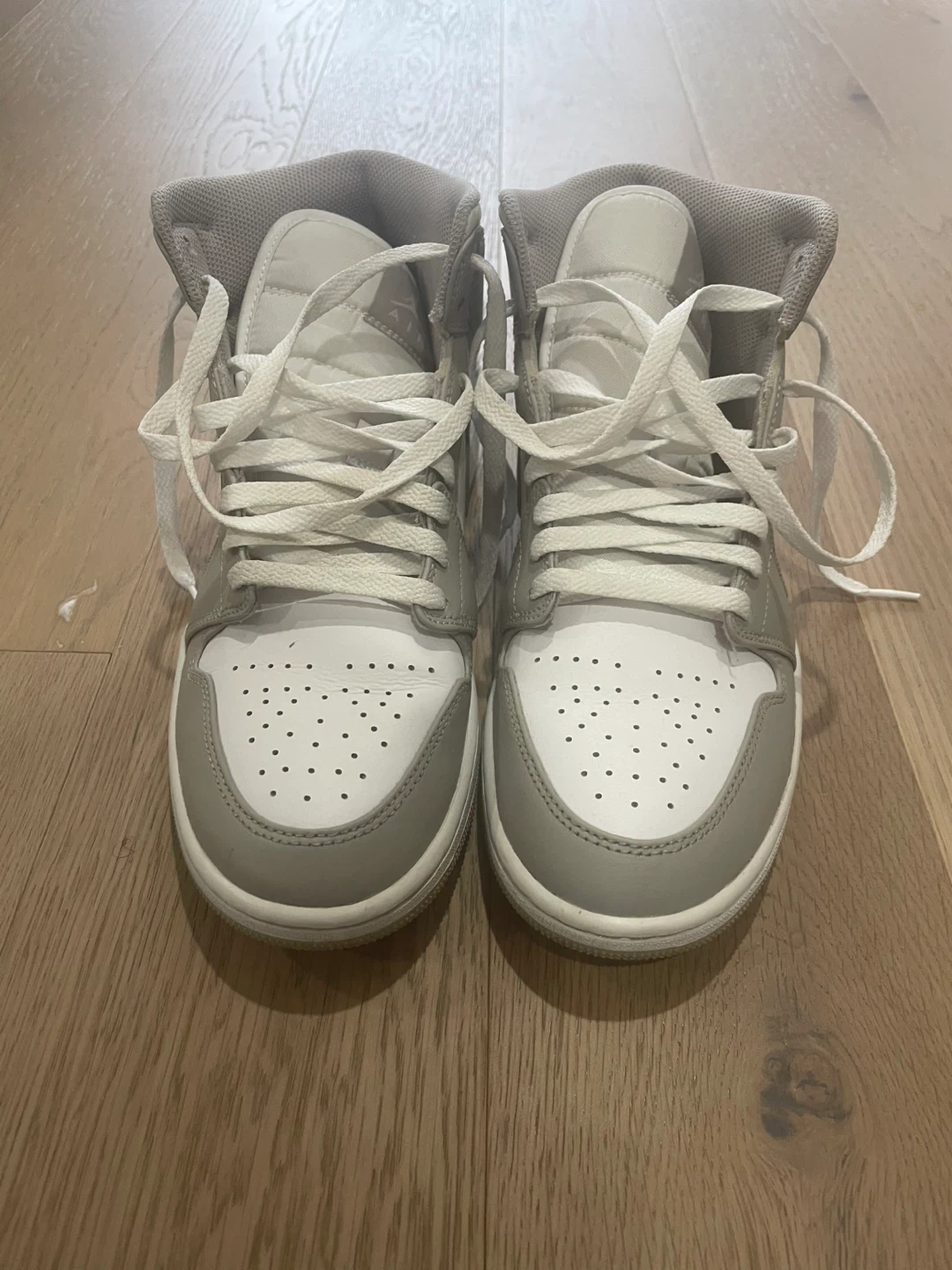 These are Air Jordan 1 Mid SE sneakers in a grey fog colourway. They feature a classic mid-top silhouette with a leather and synthetic upper. This pair is great for casual wear and everyday styling.