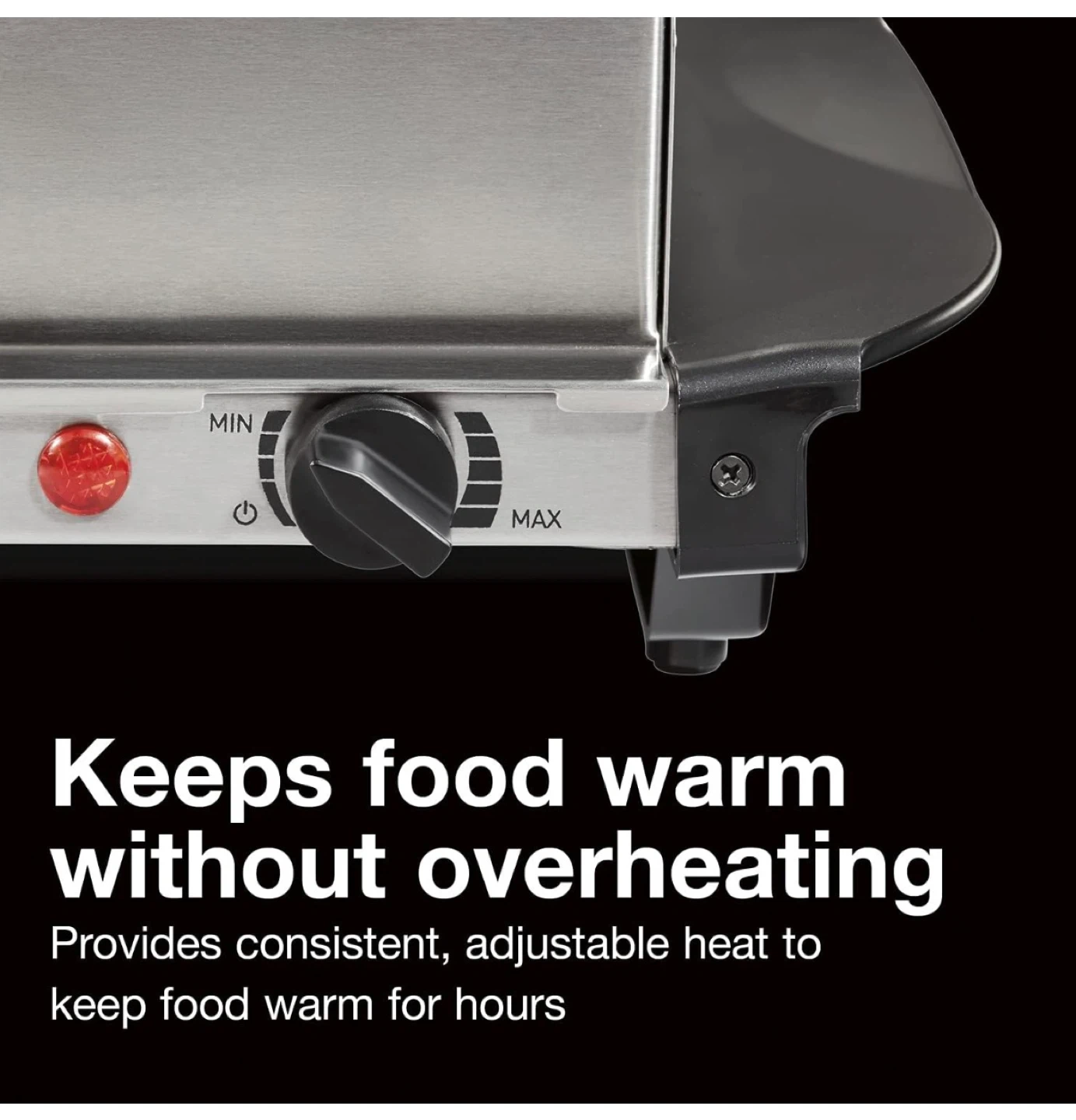 Keep your favourite dishes warm for parties or events! This buffet server includes three 2.5-quart stainless steel pans with transparent lids. It easily converts to a warming tray for more serving options. Provides consistent, adjustable heat to keep food warm for hours.