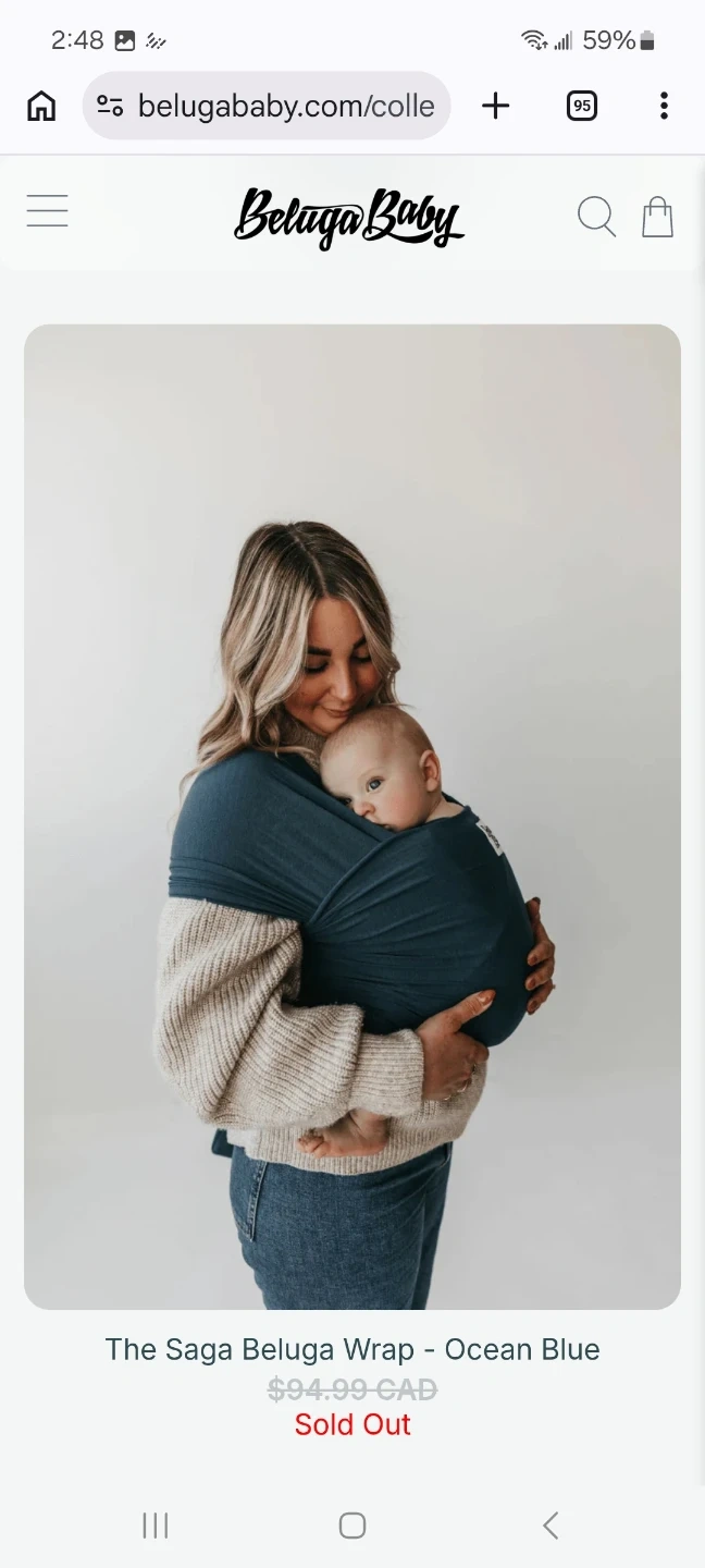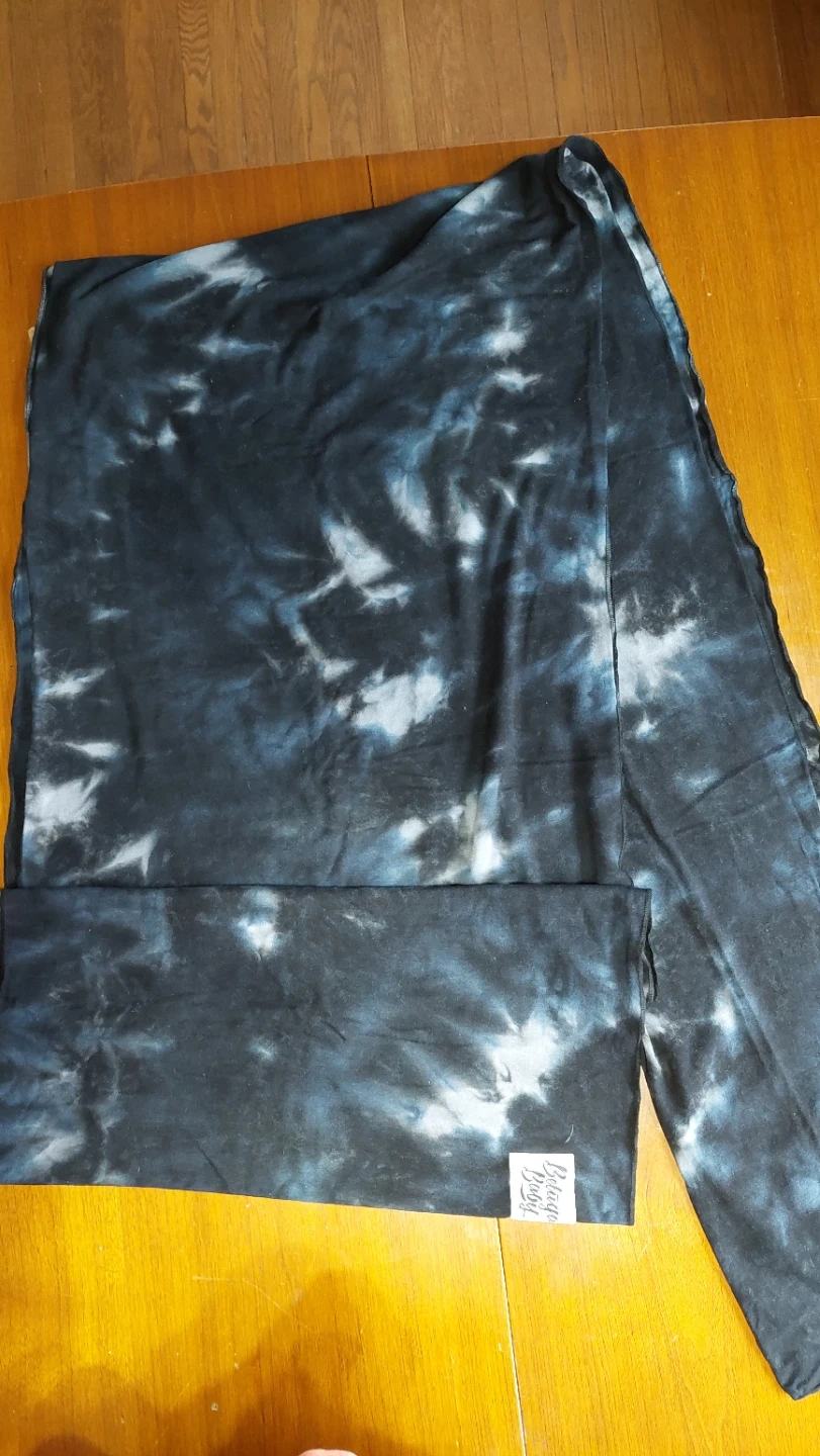 Beluga Baby Saga Wrap in Ocean Blue with a tie-dye pattern. Made with a stretchy, breathable fabric for comfortable babywearing. It's perfect for keeping your little one close and secure!