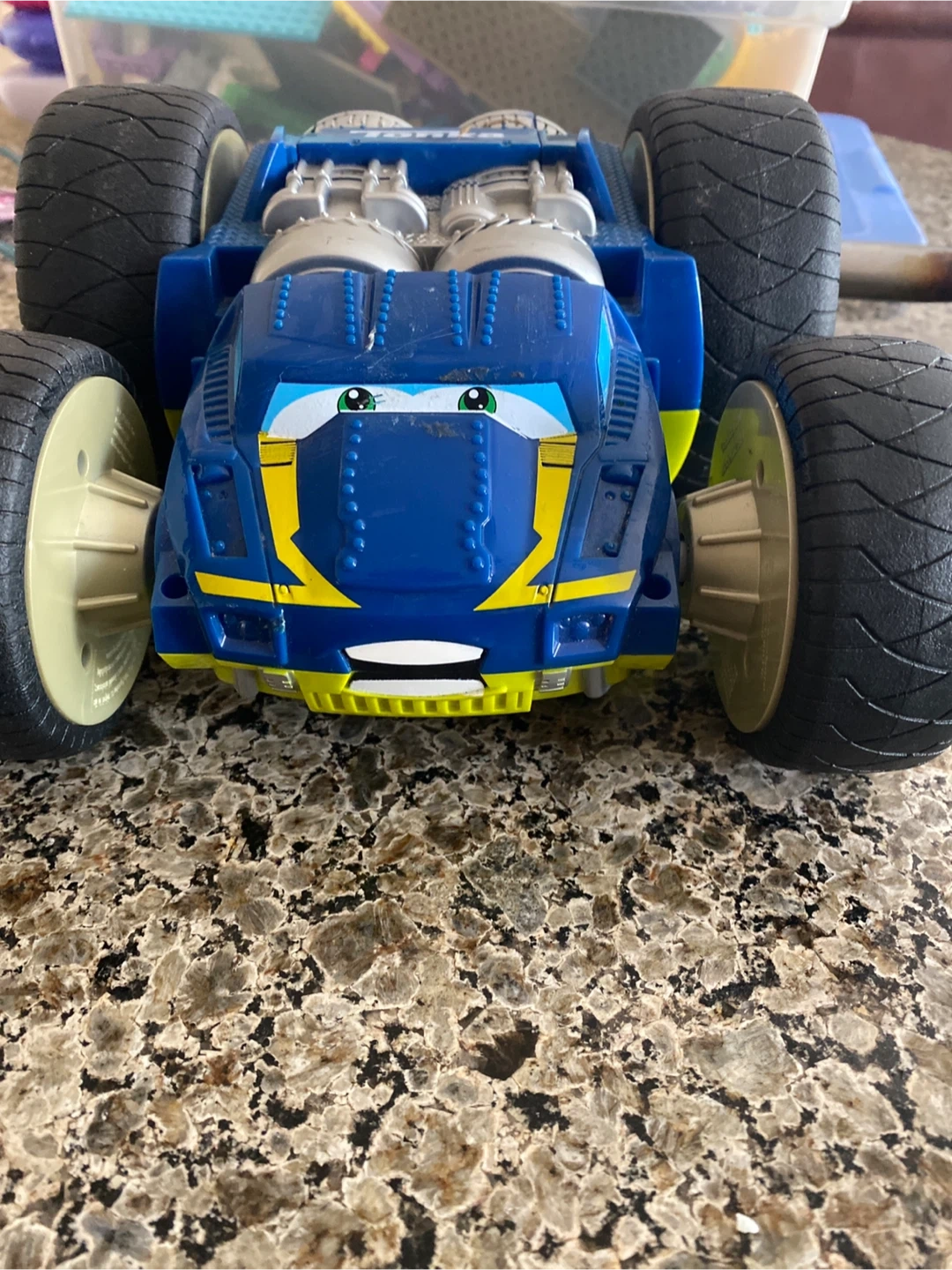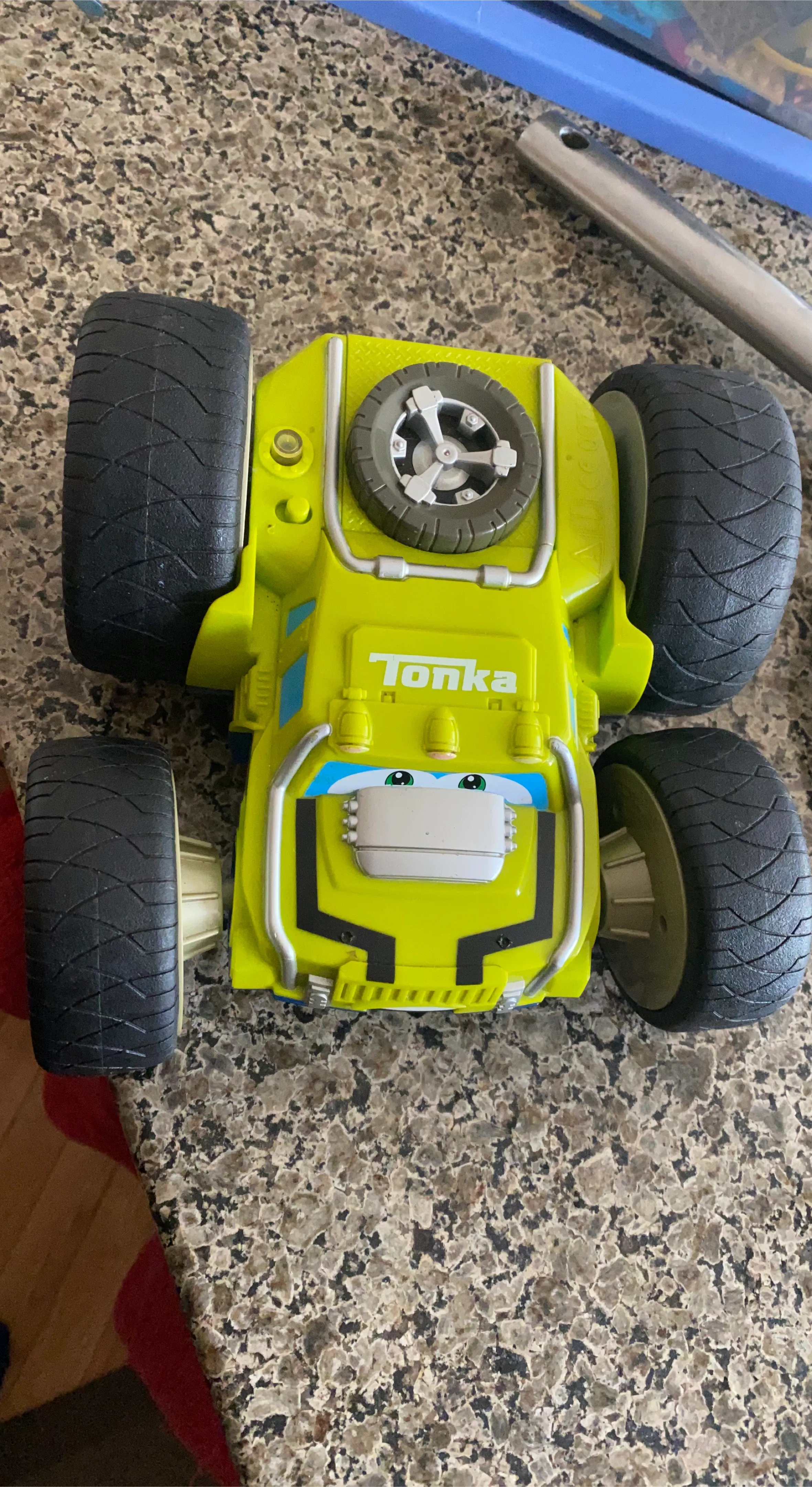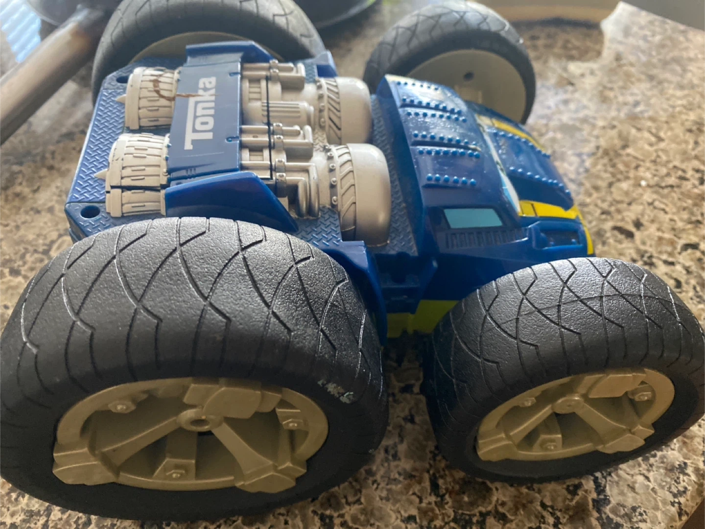 This is a durable blue and yellow Tonka monster truck toy. It is also is reversible. Green on the other side. It features large, rugged tires and a playful design. Great for imaginative play!