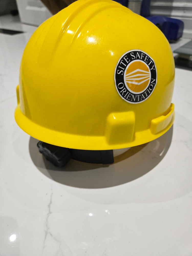 Selling a bright yellow safety helmet. It features a 'Site Safety Orientation' logo. Perfect for construction or any job requiring head protection!