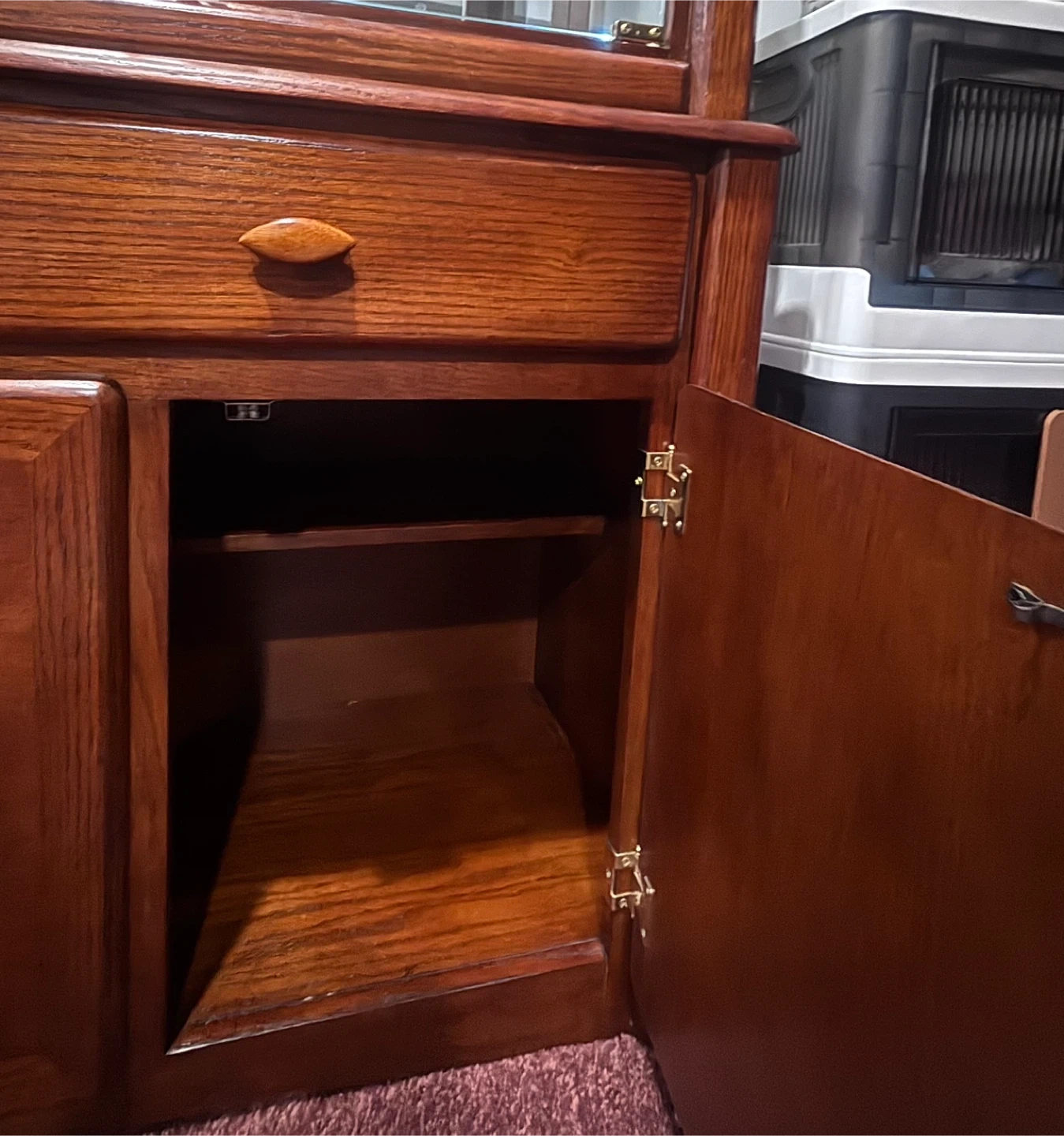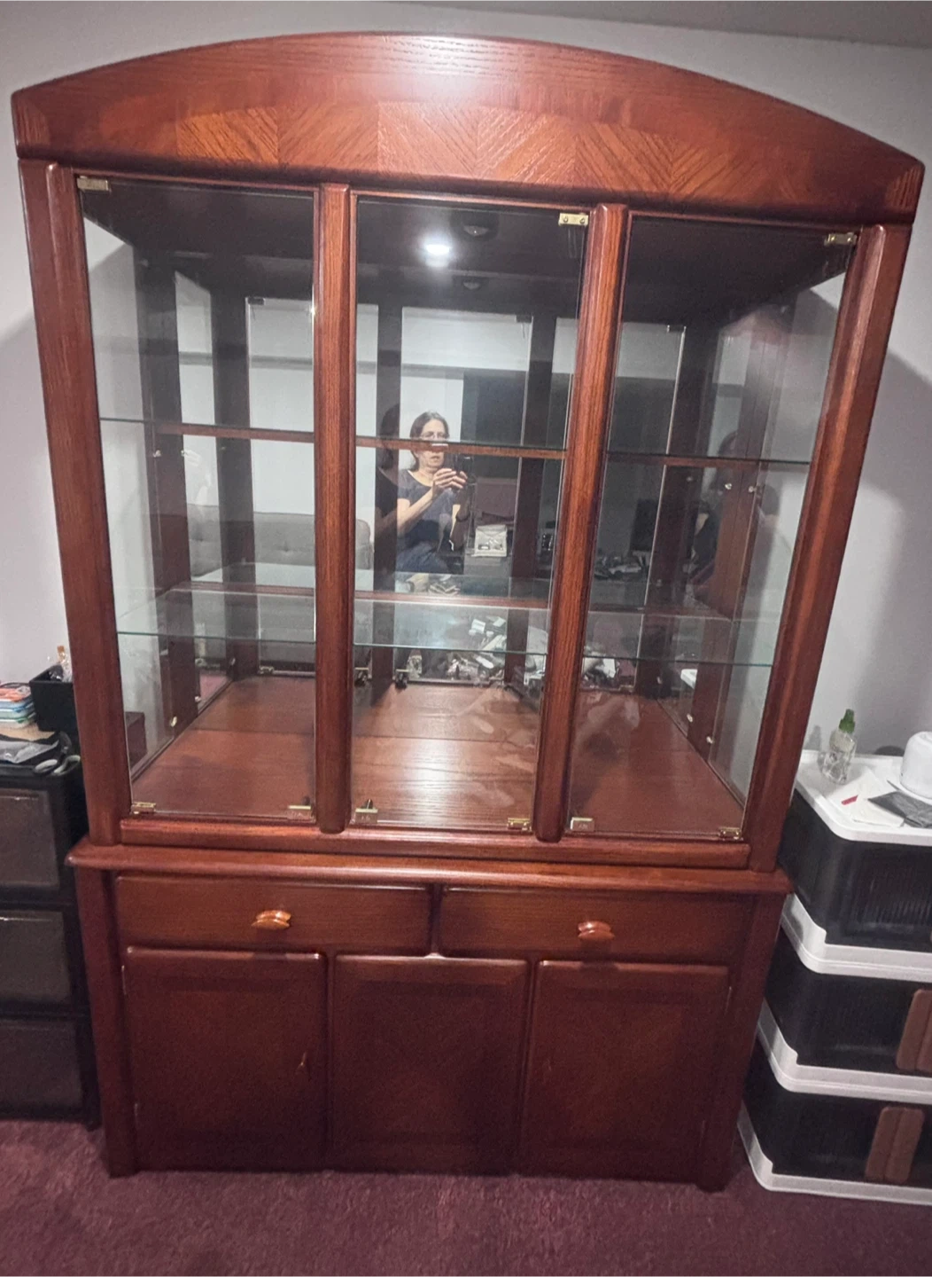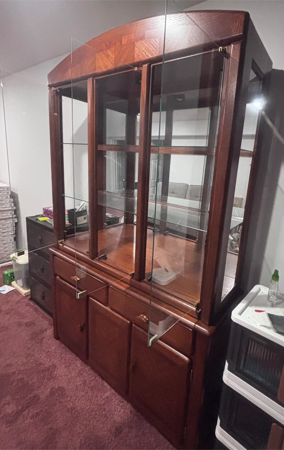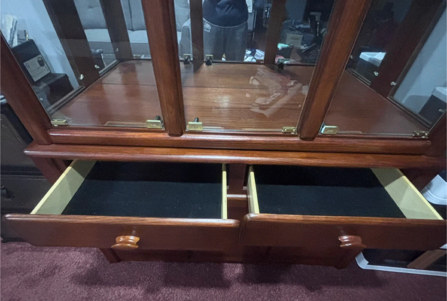 This curio cabinet features a rich wood finish and glass doors for displaying items. It has multiple shelves and drawers for storage. It's perfect for showcasing collectibles or dishes!