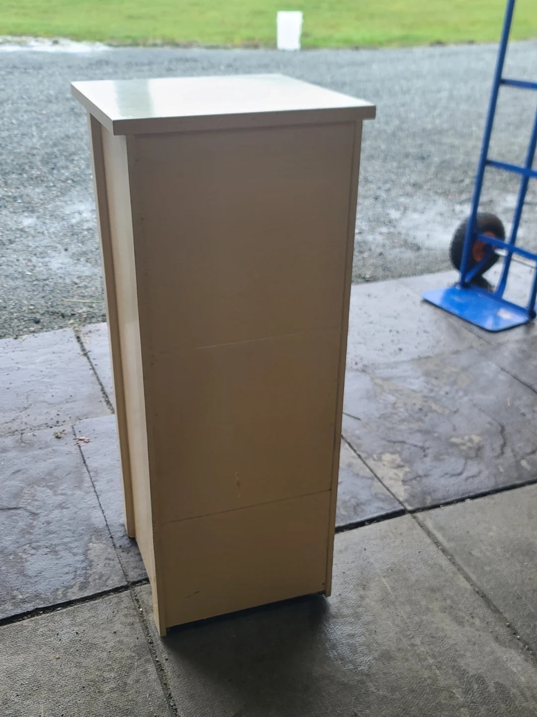 Compact 4-drawer dresser. Cream color with round knobs. All drawers slide smoothly. Good for extra storage or a small space. Measurements: W 14" X D 14" X 35". Delivery can be arranged. Viewing and pickup by appointment.