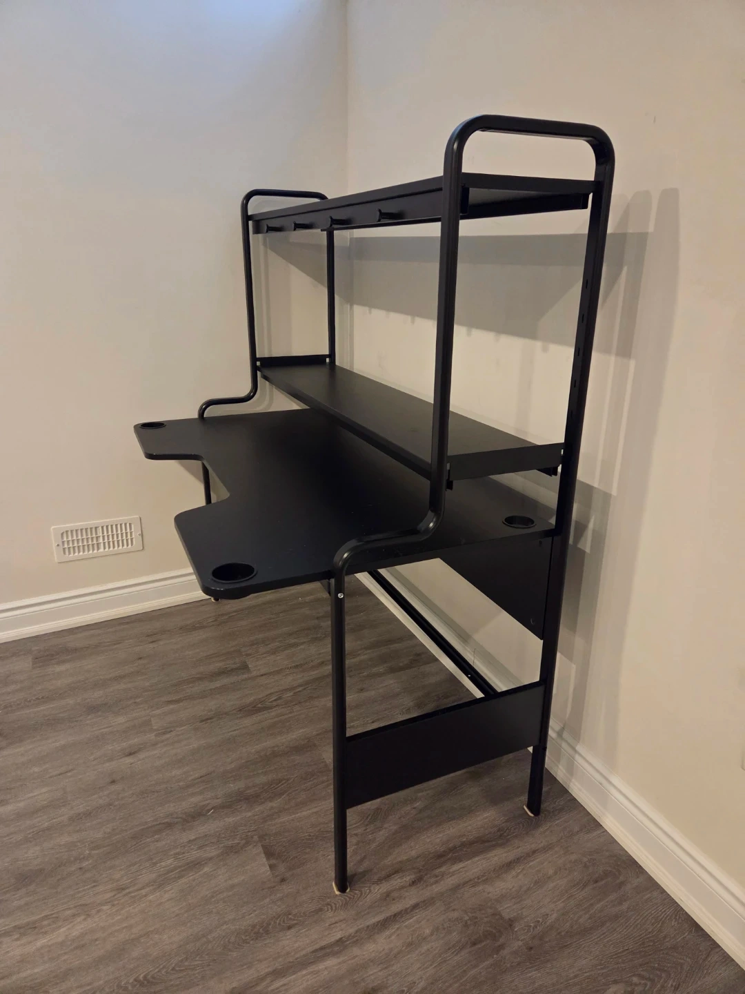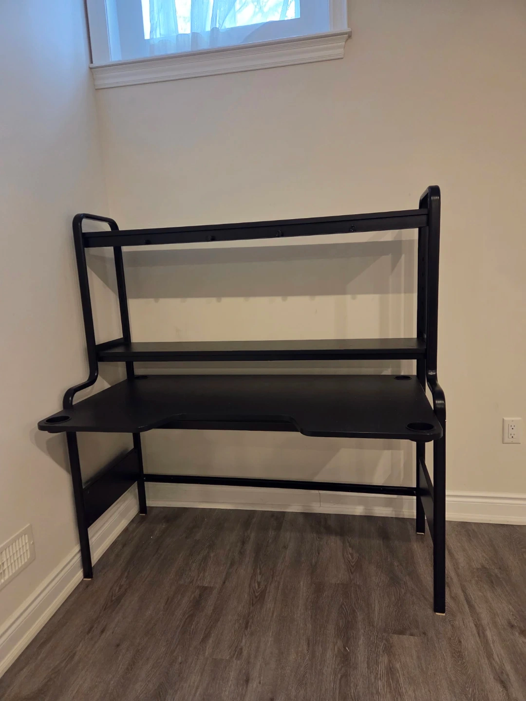 Selling a sleek black metal desk that's in great condition. It features built-in shelves, perfect for keeping your workspace organized. It's sturdy and would be great for a home office or student!