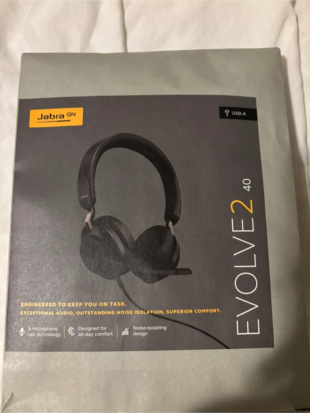 Black Jabra Evolve2 40 headset with a USB-A connection. It features 3-microphone call technology and a noise-isolating design. Includes a carrying pouch and charging cable.