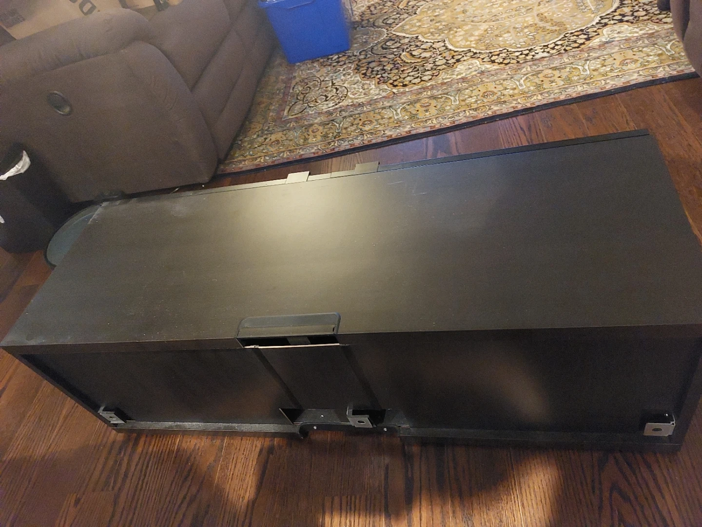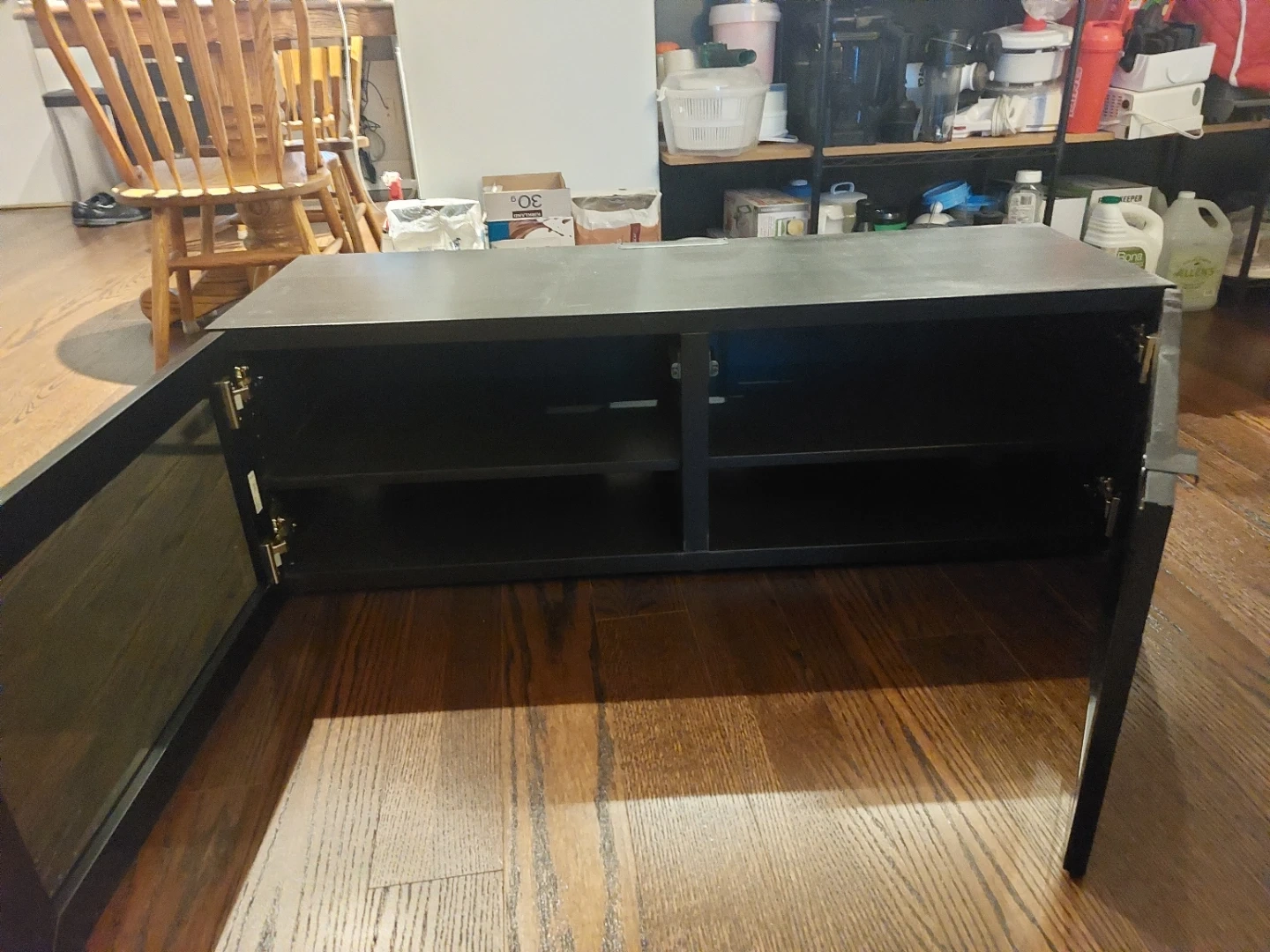 This is a black TV stand with two cabinet doors. It has open shelving in the centre. Glass door's. Sits on floor or can be mounted on the wall.