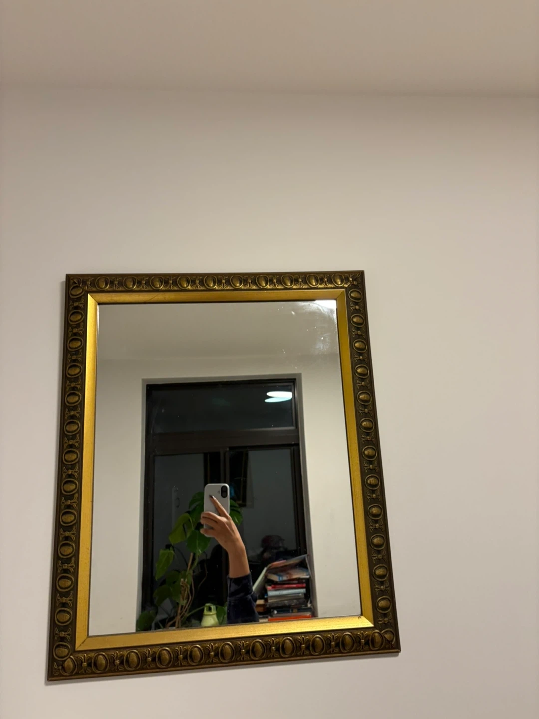 This is a decorative wall mirror with an ornate gold-colored frame. It has a classic design and can add a touch of elegance to any room. It's ready to hang and would be a nice addition to a hallway or living space.