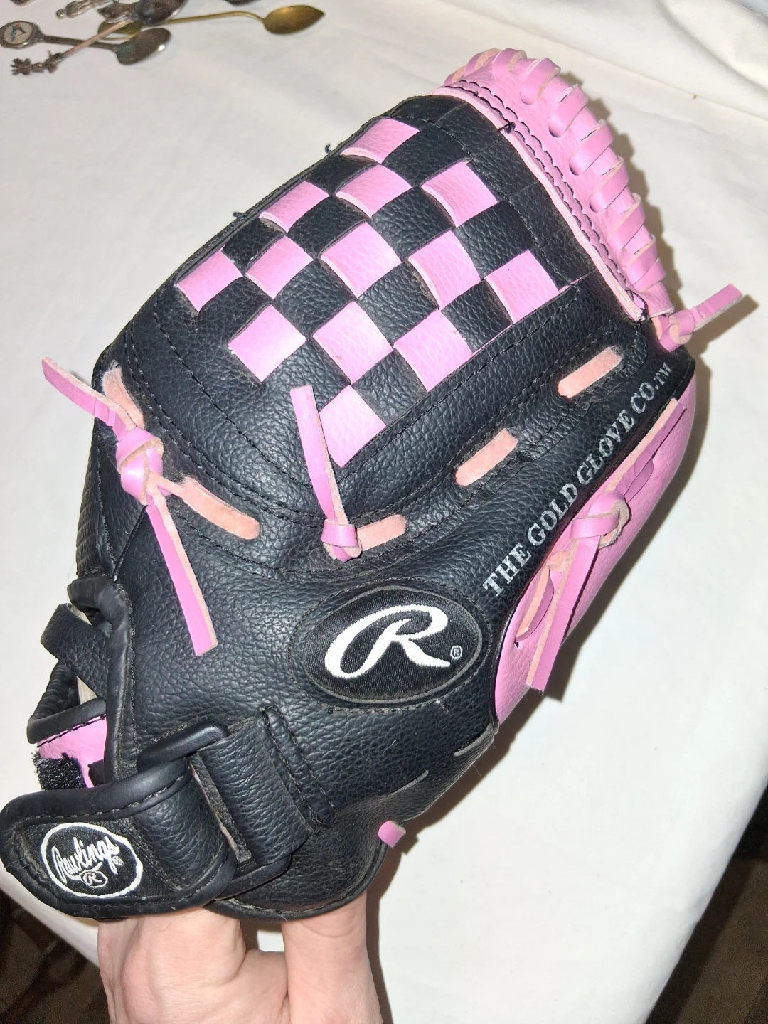 This is a Rawlings youth baseball glove. It's black and pink with a basket-web design. Glove size is suitable for young players.