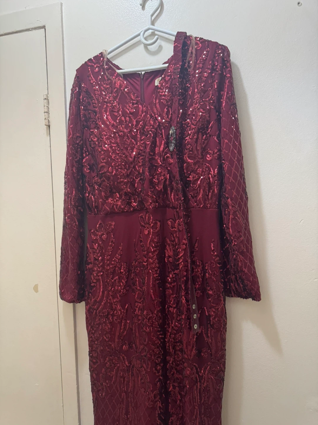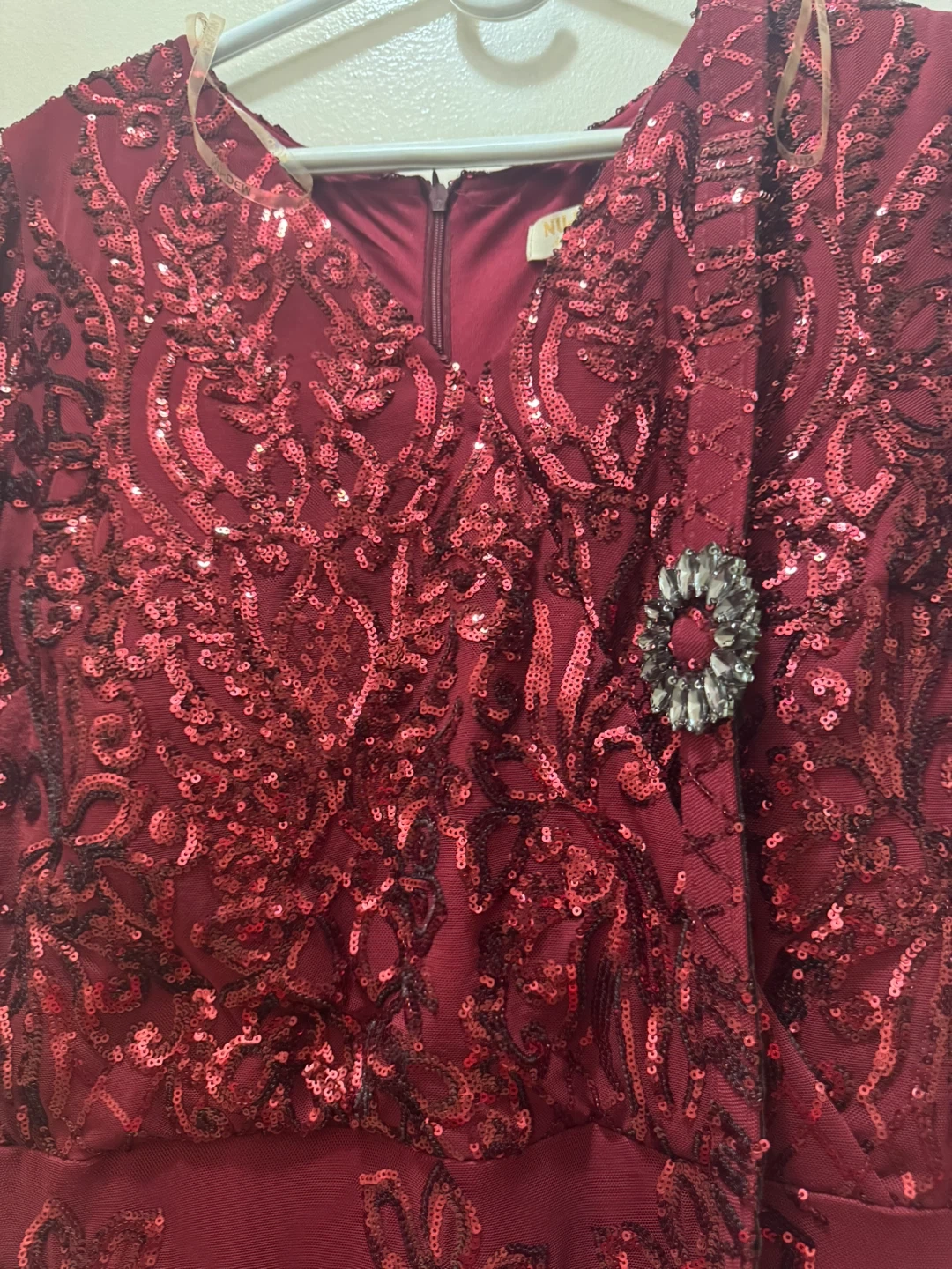 Here's a beautiful burgundy dress covered in sequins! It has long sleeves and a decorative brooch. Perfect for a special occasion!