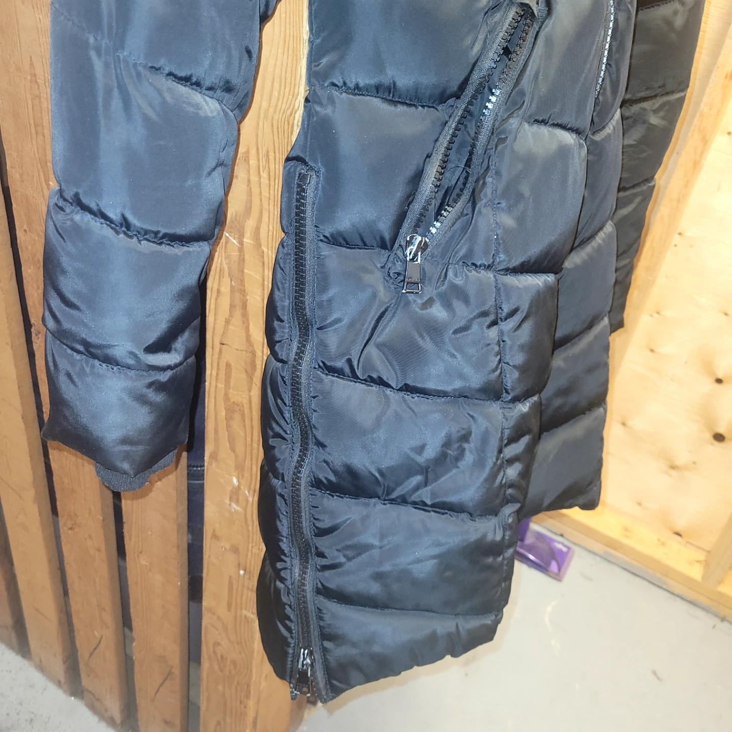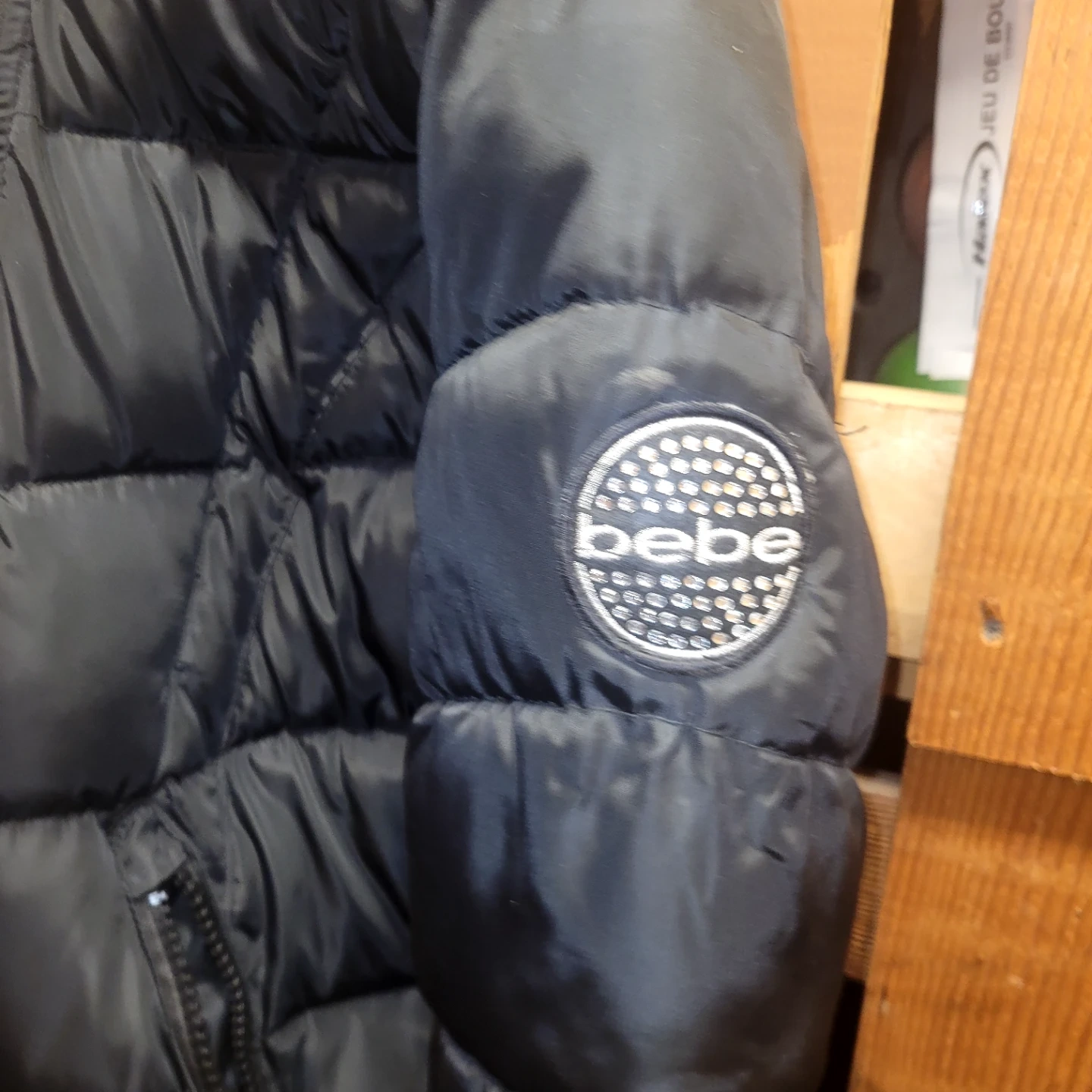 This black puffer coat is from Bebe and is a size S/P. It features a quilted design and a sherpa-lined hood. It's perfect for keeping warm on chilly days!
