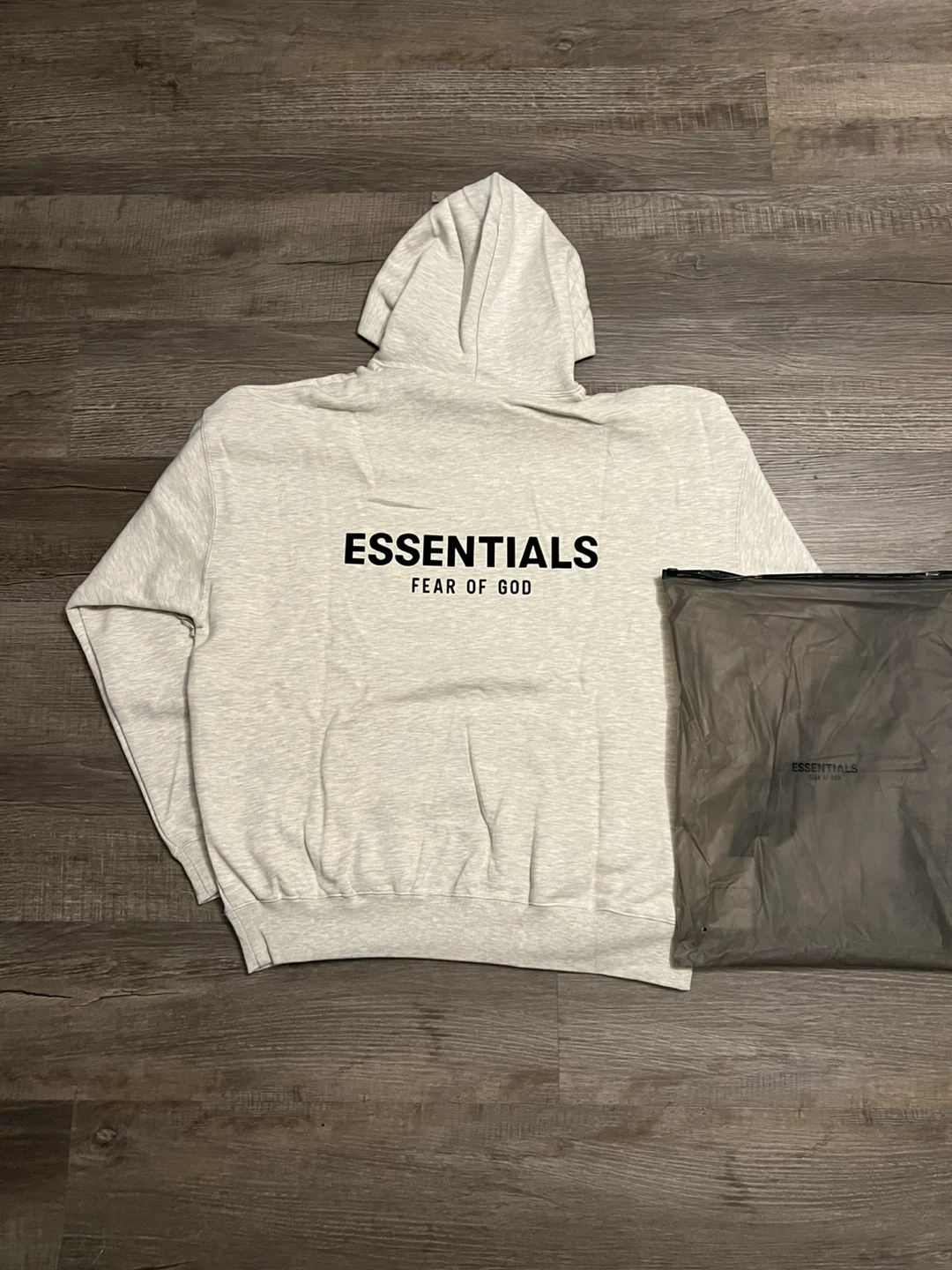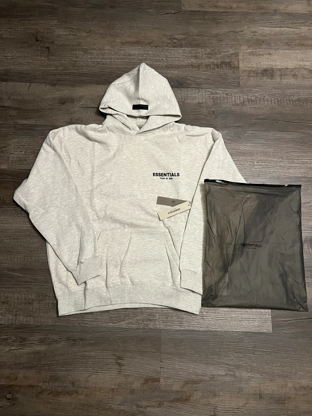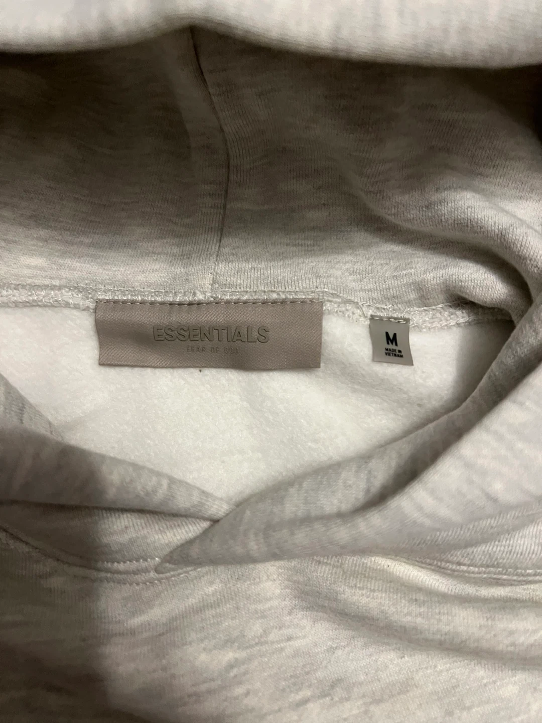 This is an ESSENTIALS by Fear of God hoodie in light grey. It's a size medium and comes with its original bag. Cotton blend material.