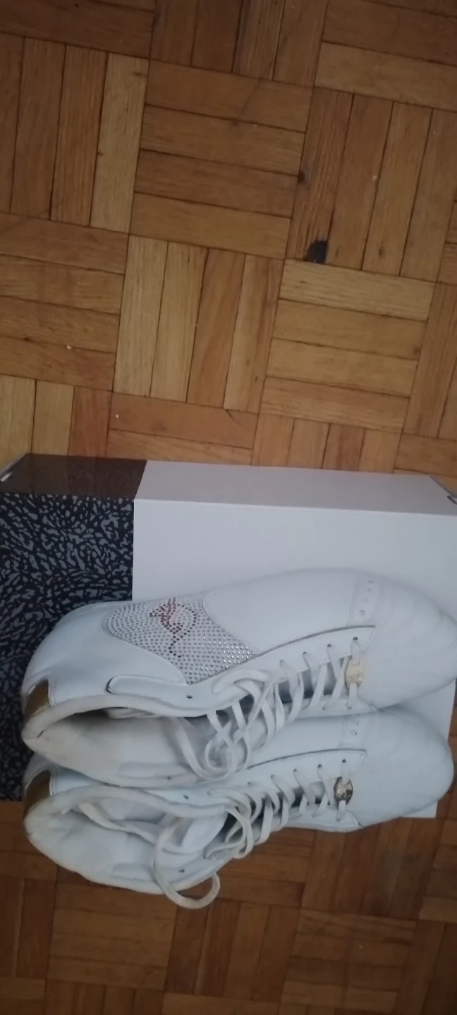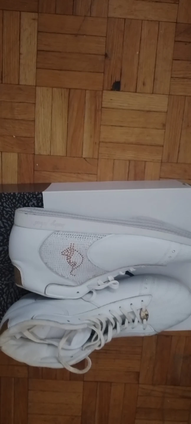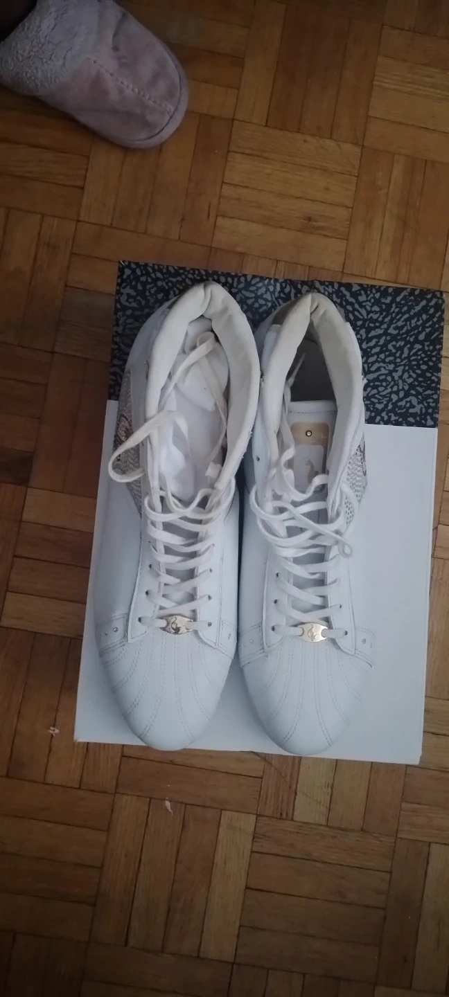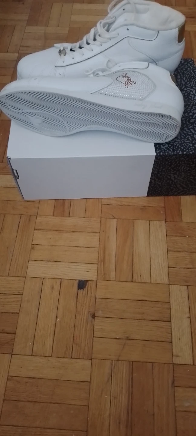 White leather high-top sneakers with gold accents. Features a patterned side panel with rhinestones. Includes original box.size .worn once.