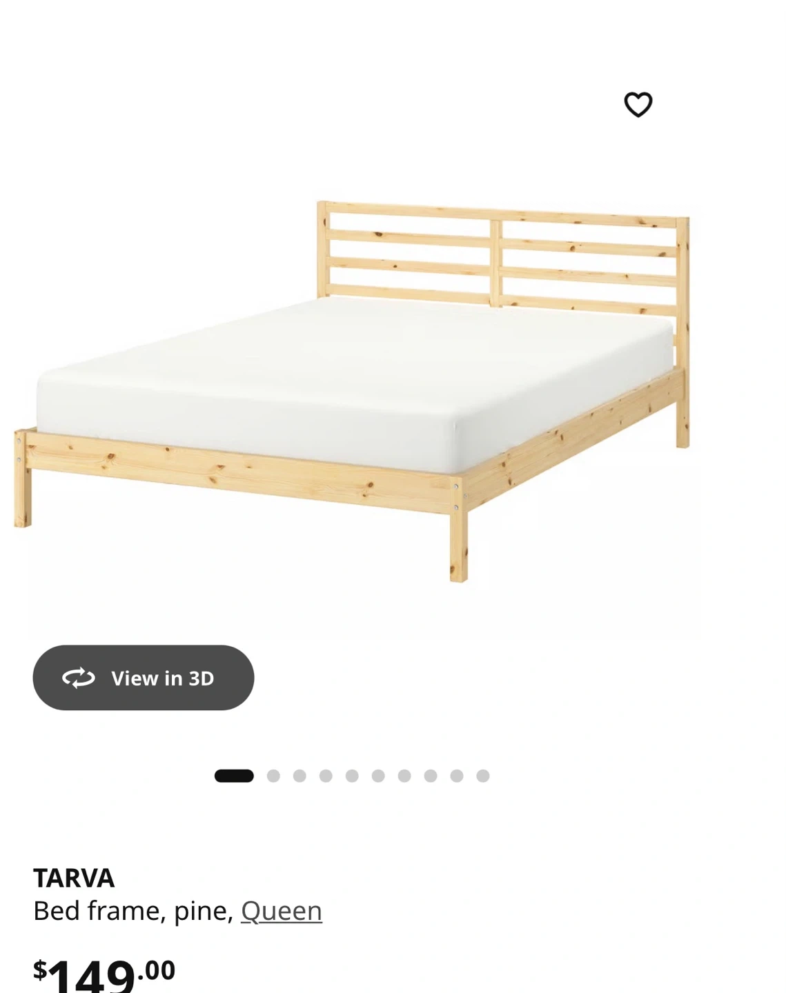 This is the IKEA TARVA bed frame in a Queen size. It's made of solid pine for a natural look. It's a sturdy bed frame that supports your mattress well. This bed frame is a great addition to any bedroom!