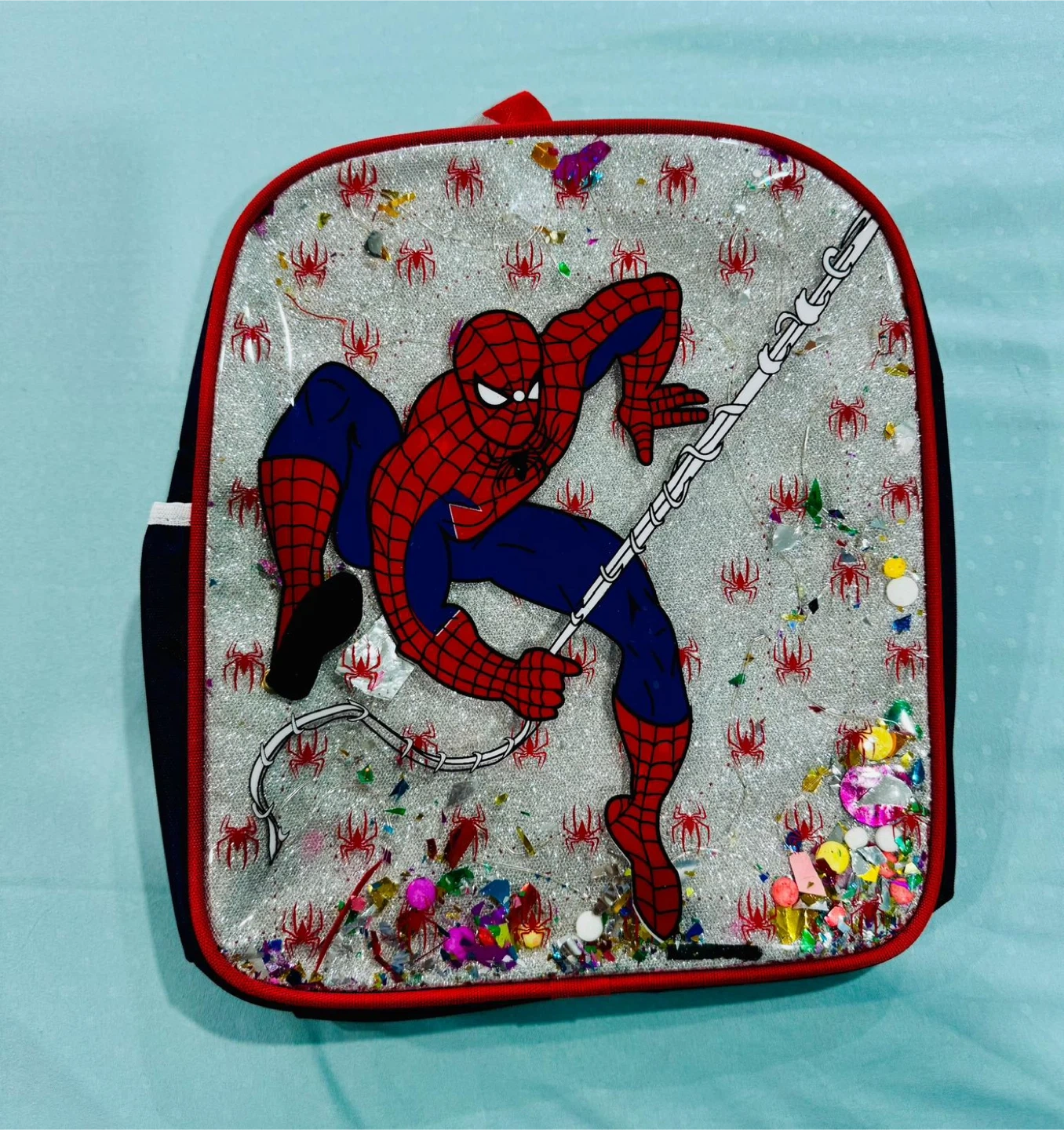 Kids' backpack featuring Spider-Man. It has adjustable straps and a zippered main compartment. The front panel has a clear window filled with glitter and tiny spider graphics.