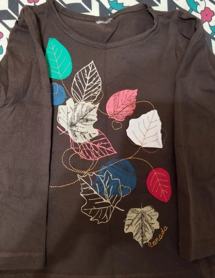 This brown long-sleeved shirt features a colourful leaf design with embroidered details. It's made of soft fabric for comfort. A cute addition to any child's wardrobe!