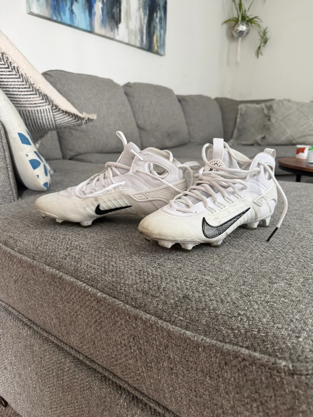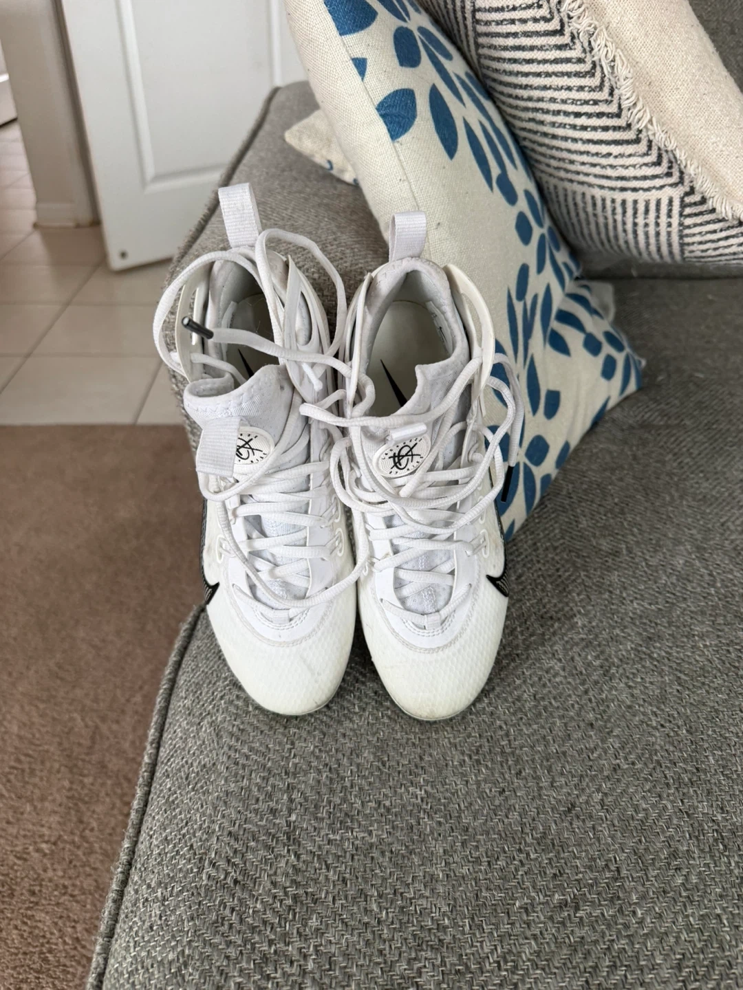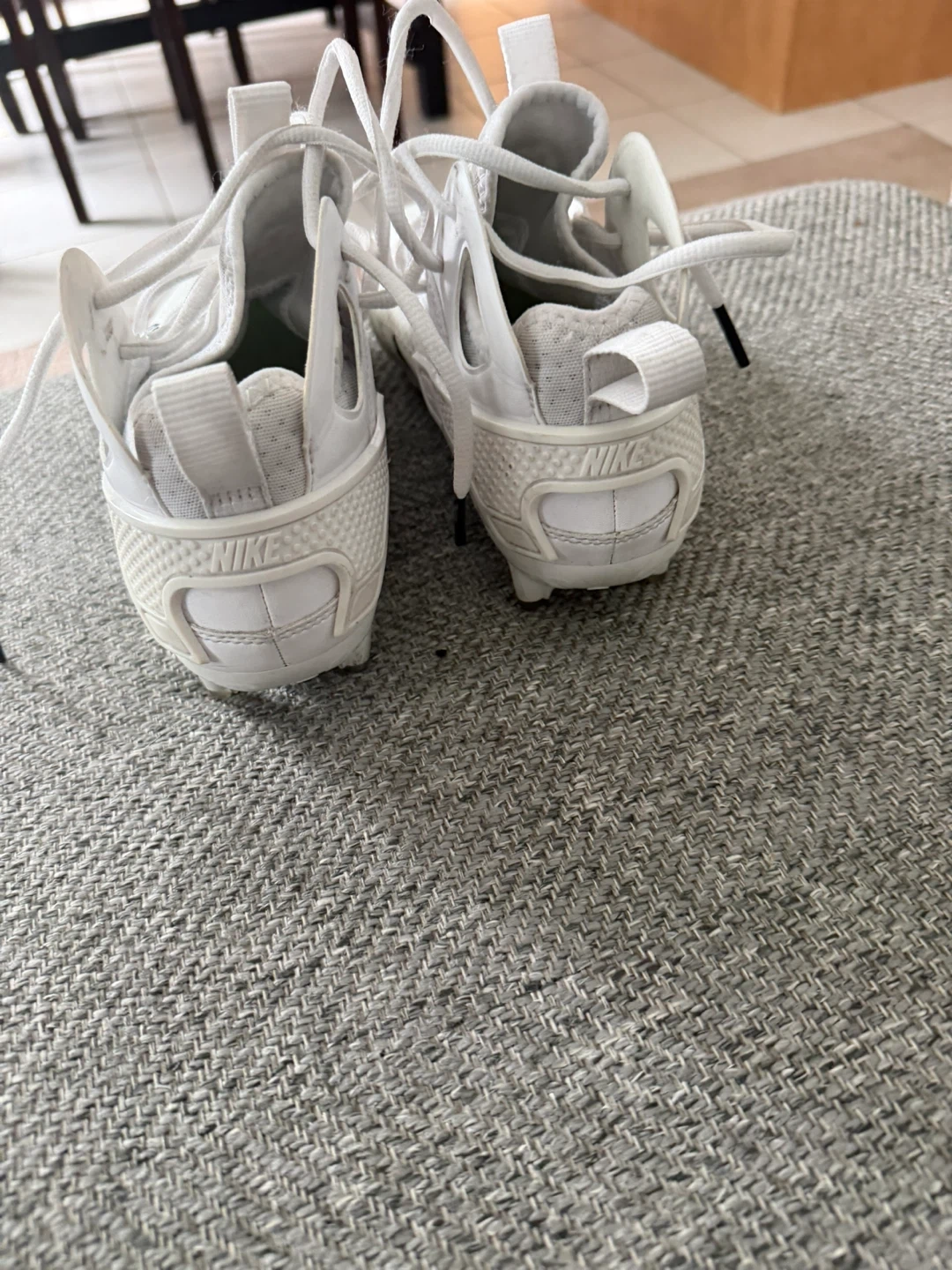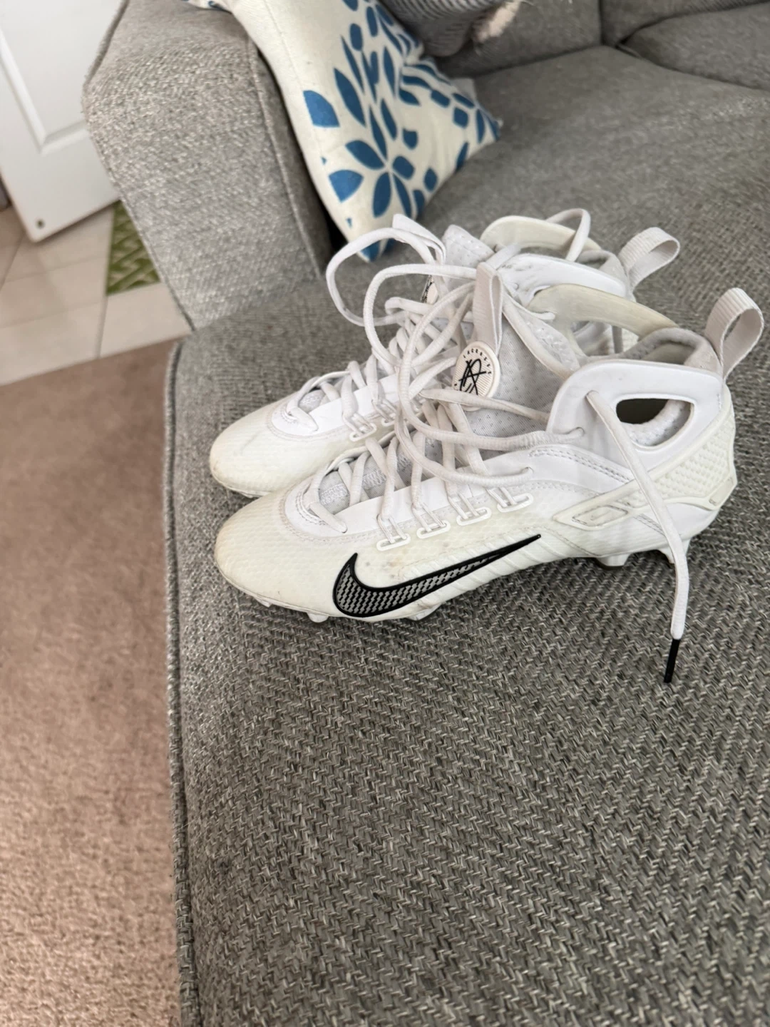White Size 5.5 Nike lacrosse cleats with laces. These cleats are white with black Nike swoosh accents. They're designed for firm ground use.