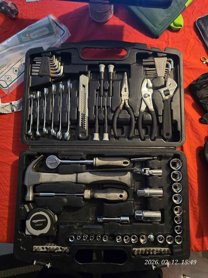 Comprehensive 131-piece tool set, including pliers, screwdrivers, wrenches, and sockets. Useful for basic home maintenance. Some screws and small parts are missing. Sockets are imperial. Come pick up only.