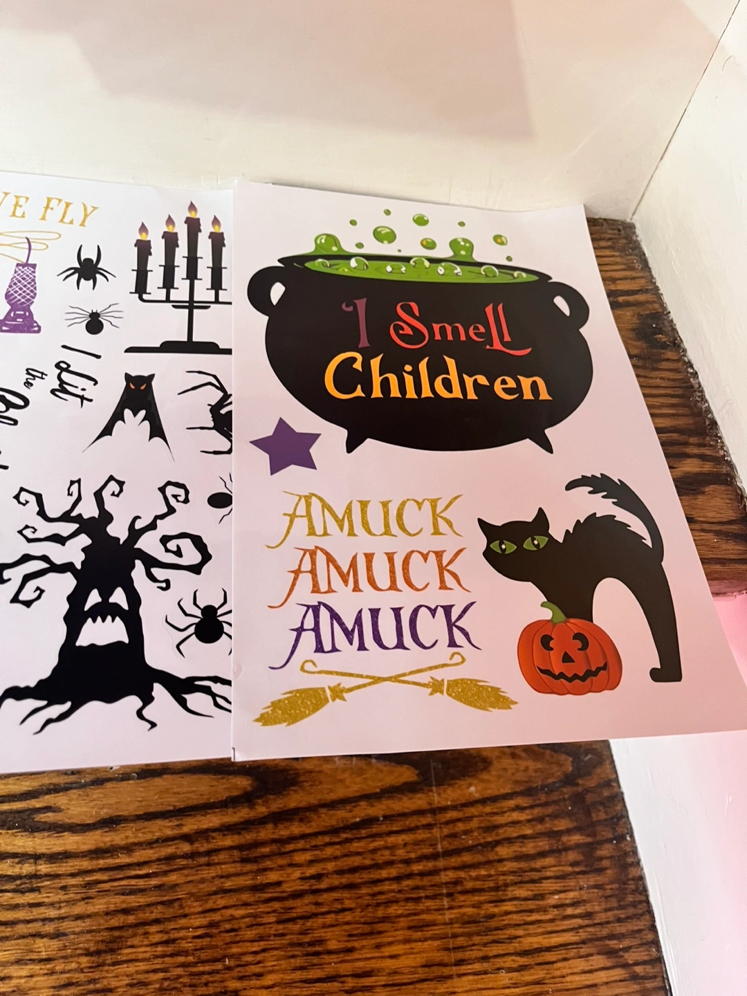 Set of Halloween-themed window stickers. Features witches, black cats, cauldrons, and other spooky imagery. Perfect for decorating for Halloween.