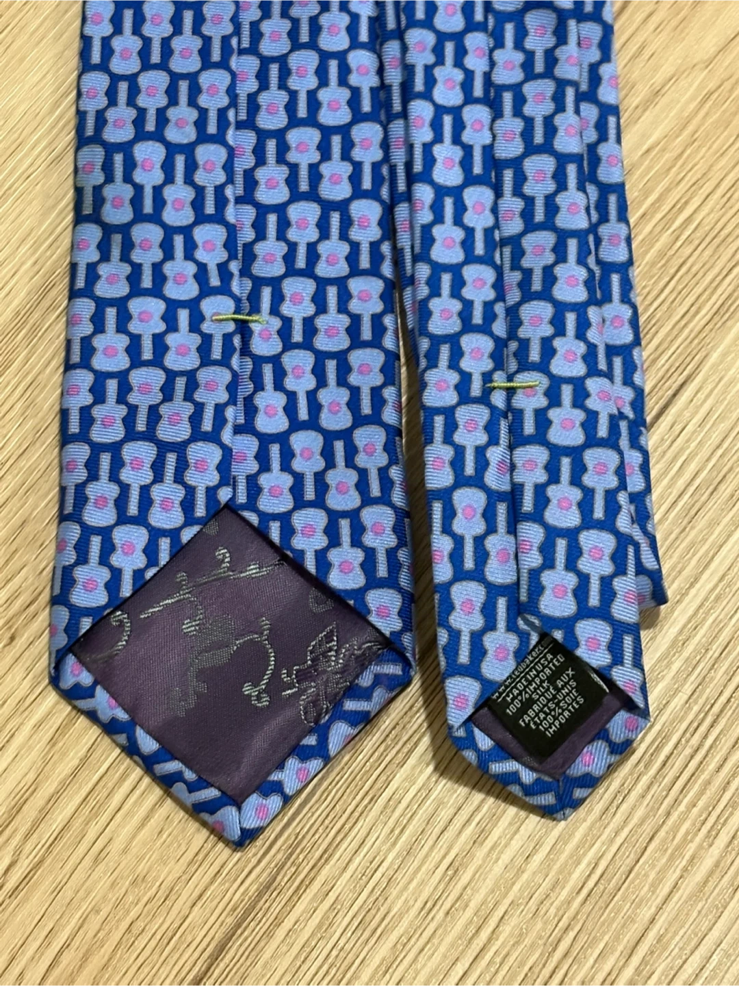 Ted Baker London silk tie. Features a fun blue and purple guitar pattern. made in USA, 100% silk.