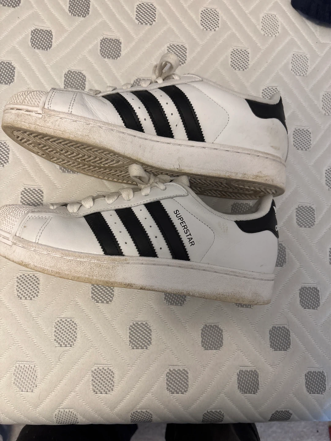 Classic white Adidas Superstar sneakers with black stripes. Leather upper with rubber shell toe. These shoes have been worn but still have lots of life left in them! Perfect for everyday wear.