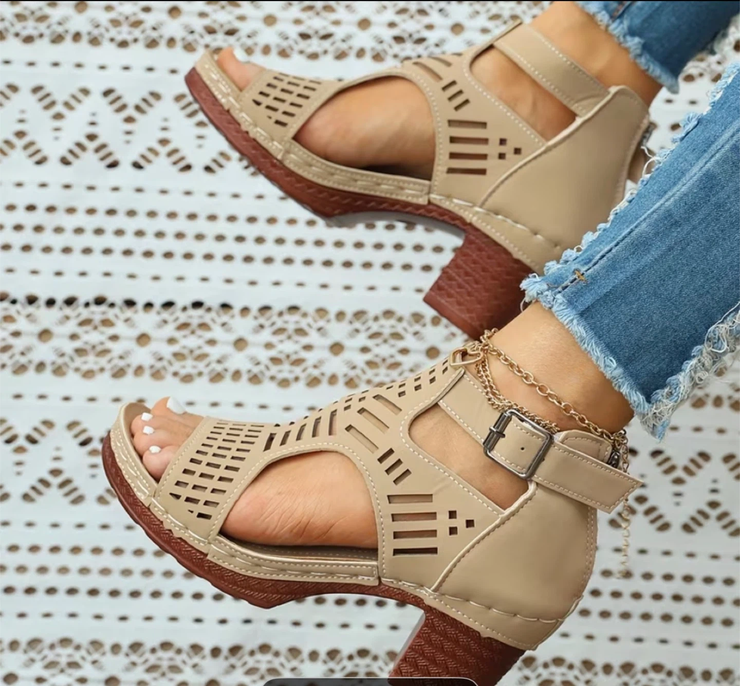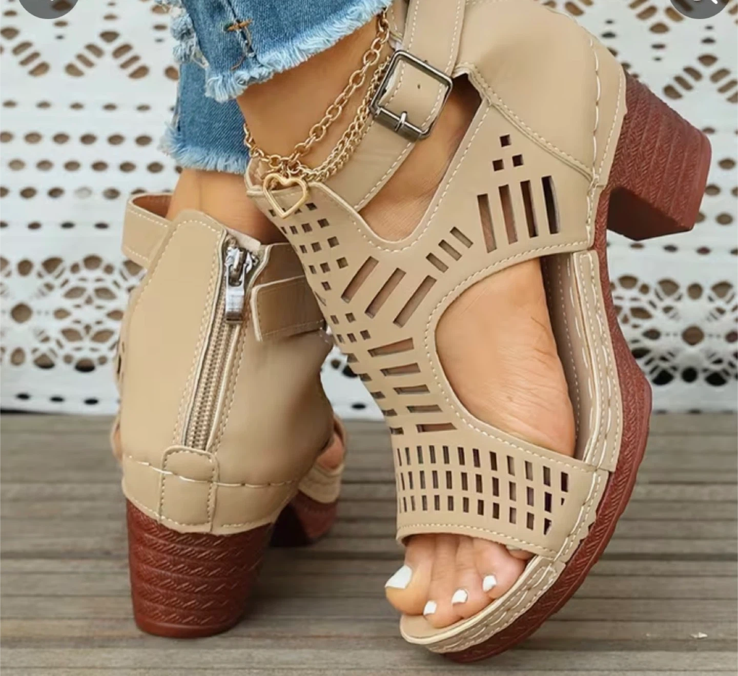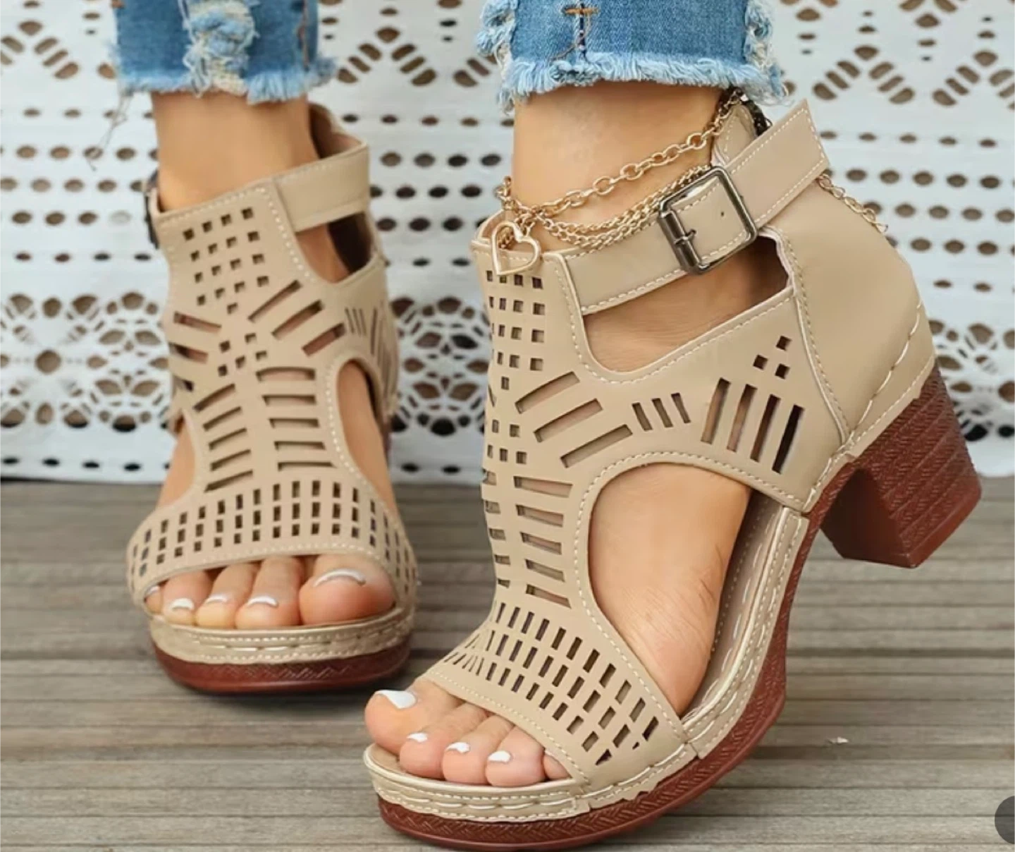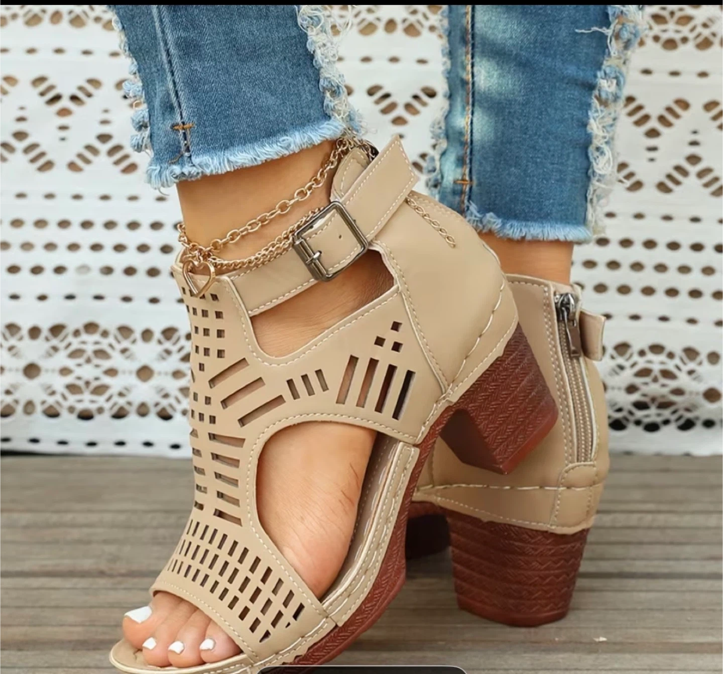 Beige heeled sandals featuring a cutout design and decorative ankle chain. They have a side zipper for easy wear and a block heel. Perfect for adding a stylish touch to your outfit!