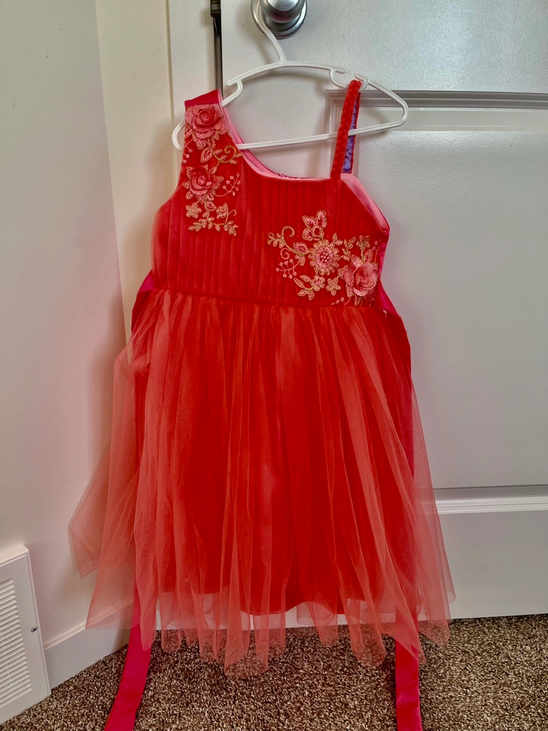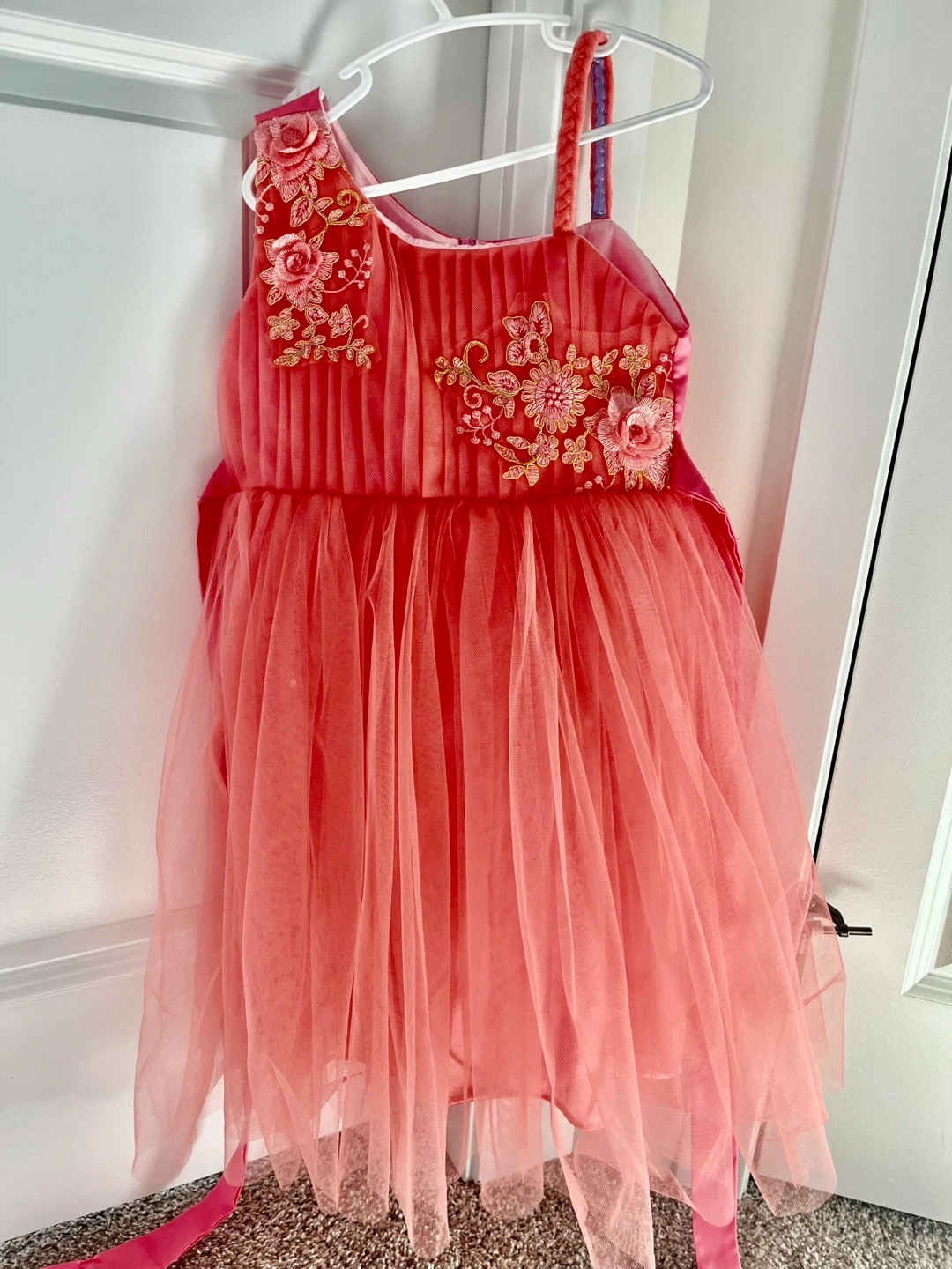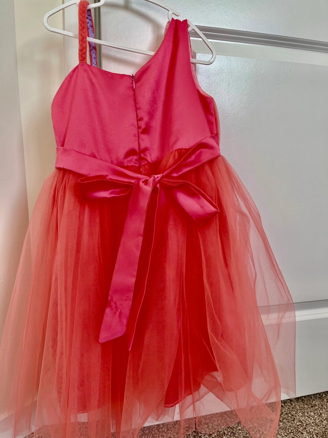 Gorgeous salmon pink tulle dress. Size 6. Features embroidered floral details and a satin bodice. One-shoulder design. Beautiful for special occasions.Brand ZARA KIDS